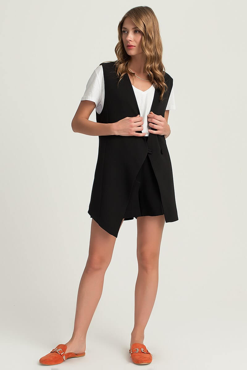 Asimetrik kesim oversize bu yelekle rahat hissedip şık gözükmeniz mümkün. Şortlarla tam bir uyum içerisinde olan bu yelekle cool görünmek hiç bu kadar kolay olmamıştı.