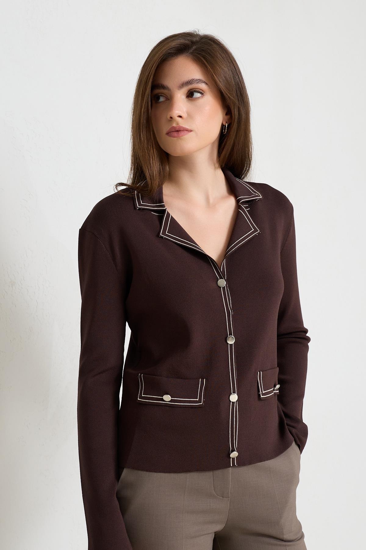 Acı-Kahve Ceket Yaka Cep Ve Çizgi Detaylı Triko (ST20250W94498001)