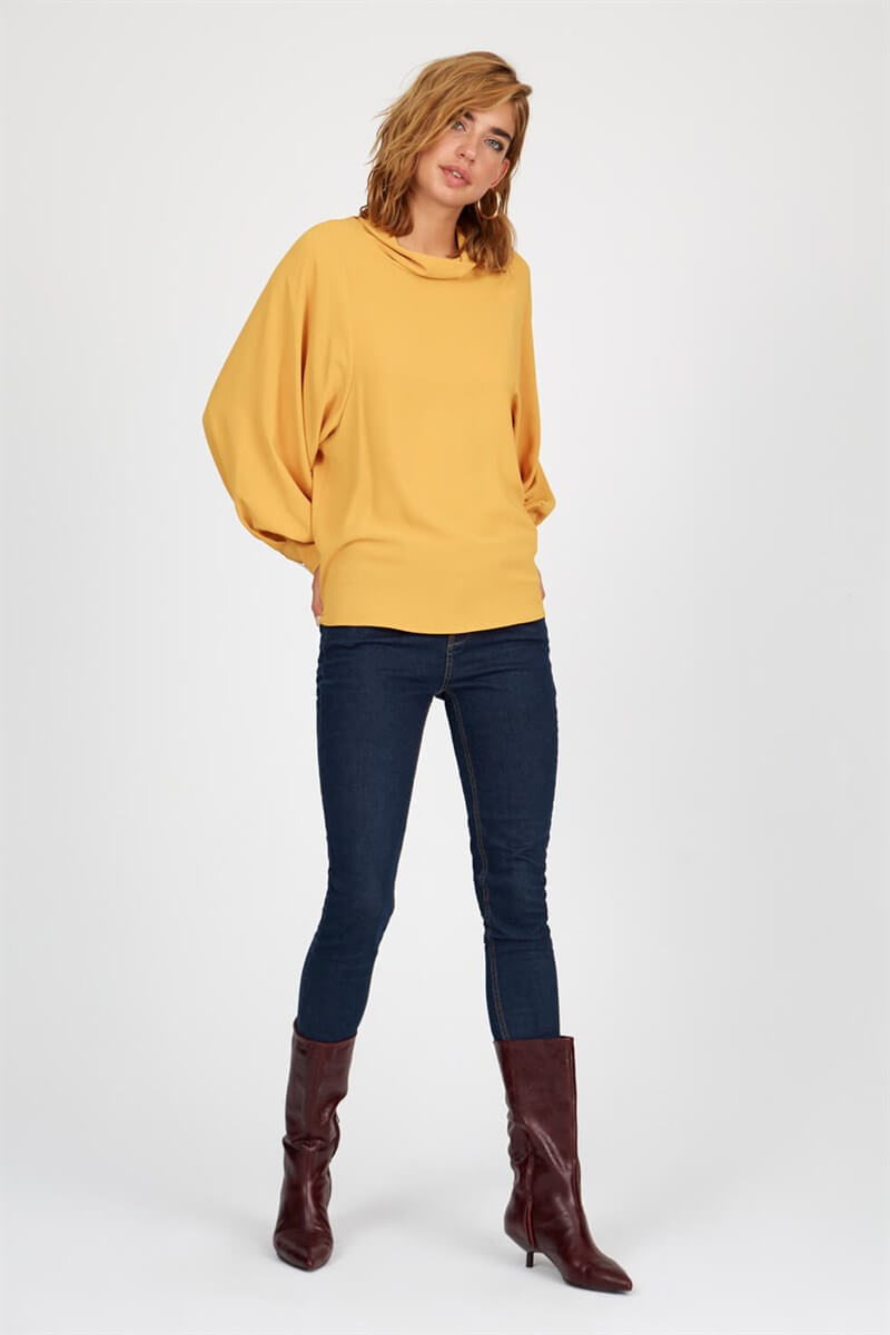 Kollardaki gold düğme detayları ve dökümlü kol kesimiyle hem rahat hem şık bu bluzu kaçırmayın!