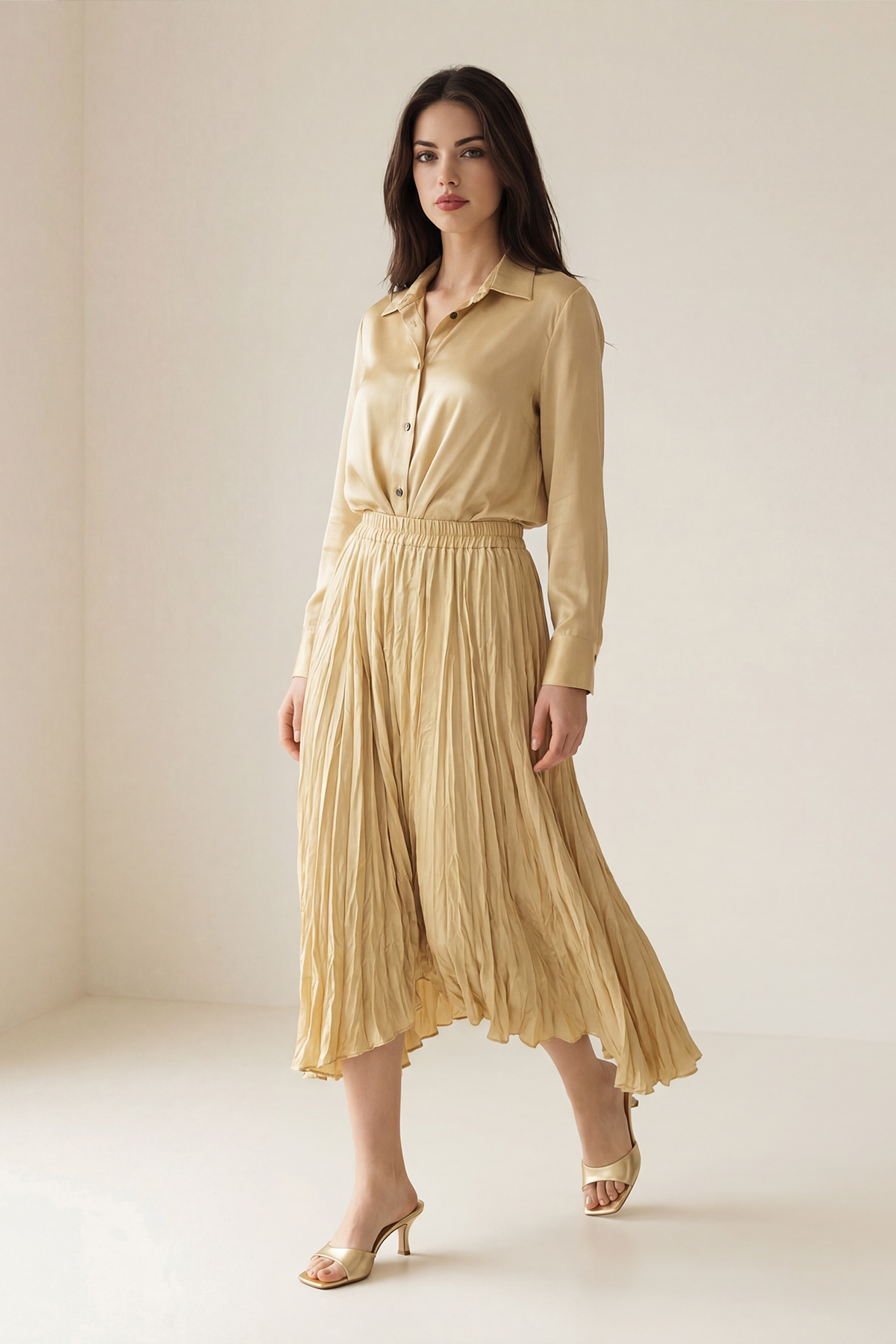 Rahat kesimi ve akıcı siluetiyle öne çıkan bu etek, günlük şıklığı zahmetsiz bir stil anlayışıyla buluşturur. Belden lastikli yapısı konforlu bir kullanım sunarken, pilise detayları eteğe hareketli ve modern bir karakter kazandırır. Midi boy uzunluğu sayesinde dengeli ve zarif bir görünüm elde edilir. Gün boyu rahatlık arayanlar için şehirli, zamansız ve çok yönlü bir gardırop parçasıdır. PREMIUM KUMAŞ VİSKON: Viskon doğal bir kumaştır. Yumuşak, hafif, parlak, hafif ve akışkan nefes alabilir özelliklere sahip olduğu için rahat giyim için kullanılır. Viskon ayrıca sıcakta serin tutma özelliği ile yazlık giysilerde tercih edilir.