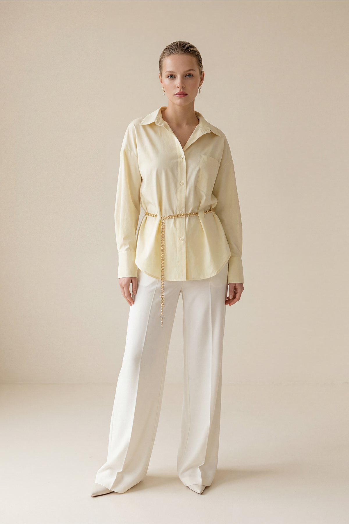 Bel kısmında yer alan zincir detayıyla tasarımına modern ve iddialı bir vurgu kazandıran bu uzun kollu gömlek, silueti zarifçe tanımlar. Akıcı yapısı gün boyu konfor sunarken, zincirin kattığı sofistike dokunuş stile güçlü bir karakter kazandırır. Ofis stilinden şehirli akşam kombinlerine kadar fark yaratan, rafine bir parçadır.