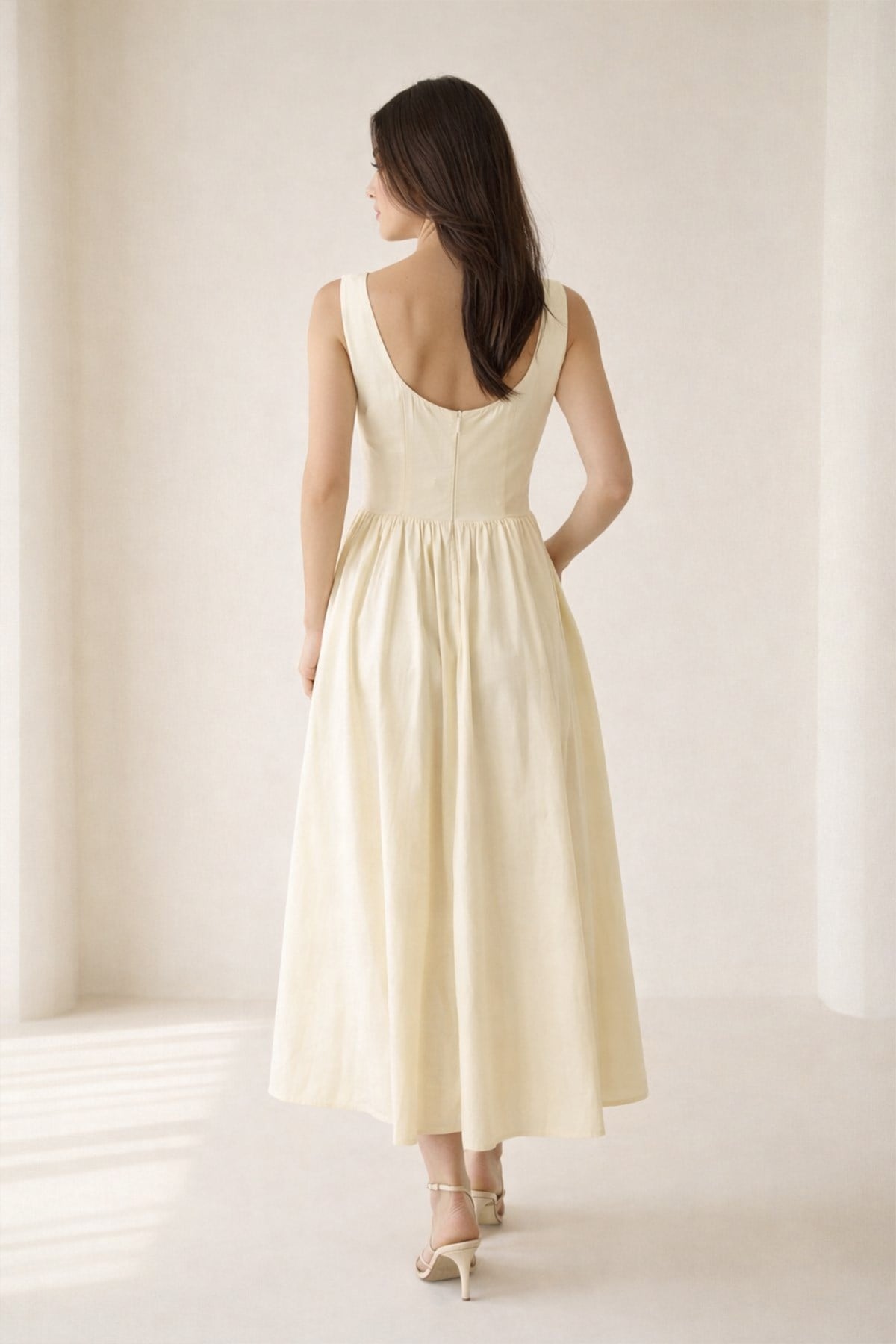 Zarif ve dengeli siluetiyle öne çıkan bu midi boy elbise, kolsuz tasarımı ve belden oturtmalı formuyla feminen bir duruş sunar. Vücut hatlarını doğal bir şekilde vurgulayan kesimi, gün boyu konforlu bir kullanım sağlar. Günlük şehir stilinden özel davetlere kadar farklı kombinlerle kolayca uyarlanabilen, zamansız bir gardırop parçasıdır.