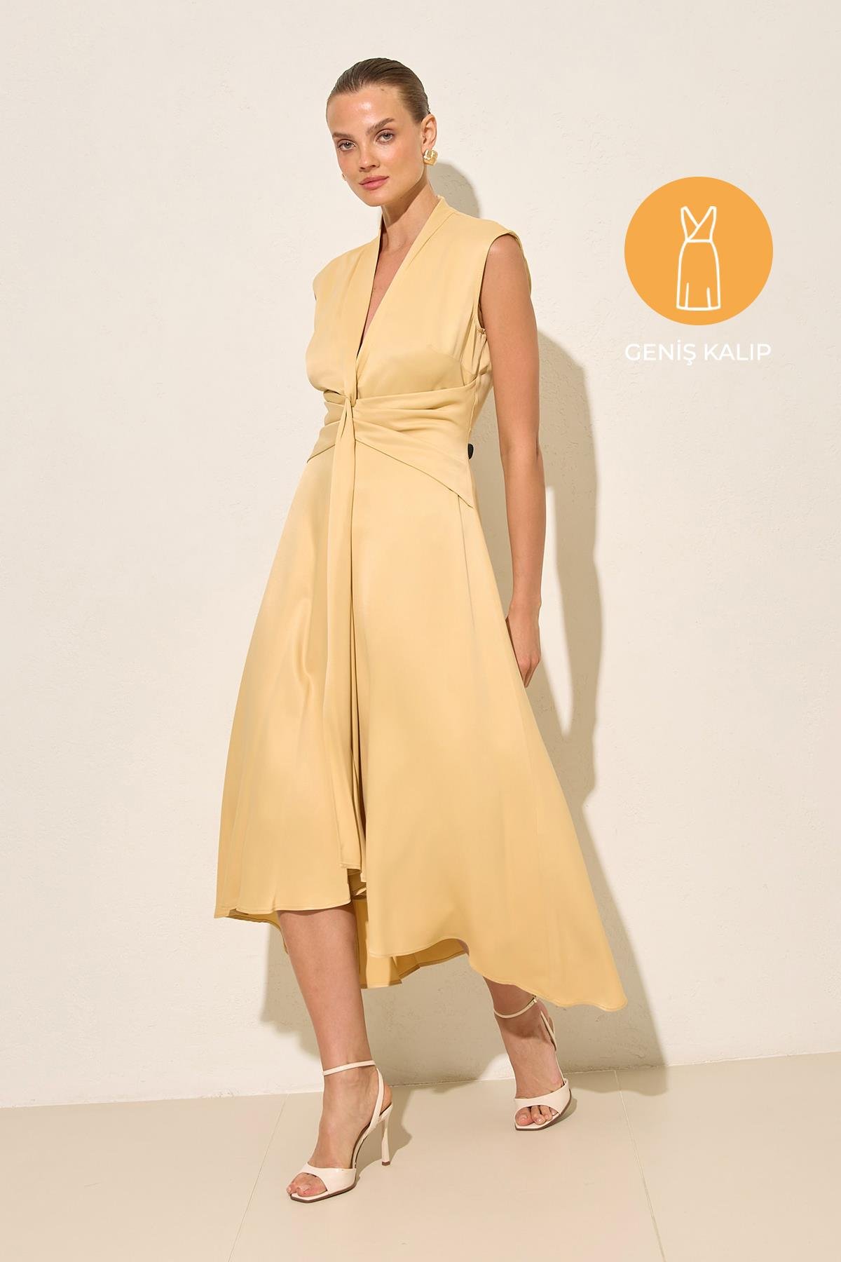 Şıklığı ve zarafeti bir arada sunan V yaka belden detaylı midi boy kolsuz elbise, modern ve sofistike bir görünüm elde etmek isteyenler için ideal bir tercihtir. V yaka detayı, boyun bölgesini zarif bir şekilde vurgulayarak, zarif bir siluet oluşturur. Bel kısmındaki detay ise, vücudu güzel bir şekilde sarar ve ince bir görünüm sağlar. Midi boy kesimi, hem şık bir havası hem de rahatlığıyla dikkat çeker, hem gündüz hem de akşam etkinliklerinde rahatlıkla tercih edilebilir. Kolsuz yapısı, yaz aylarında şıklığına şıklık katarken, katmanlı aksesuarlarla da kombinlenebilir. Hem şık hem rahat bir stil arayanlar için mükemmel bir elbise seçeneğidir.