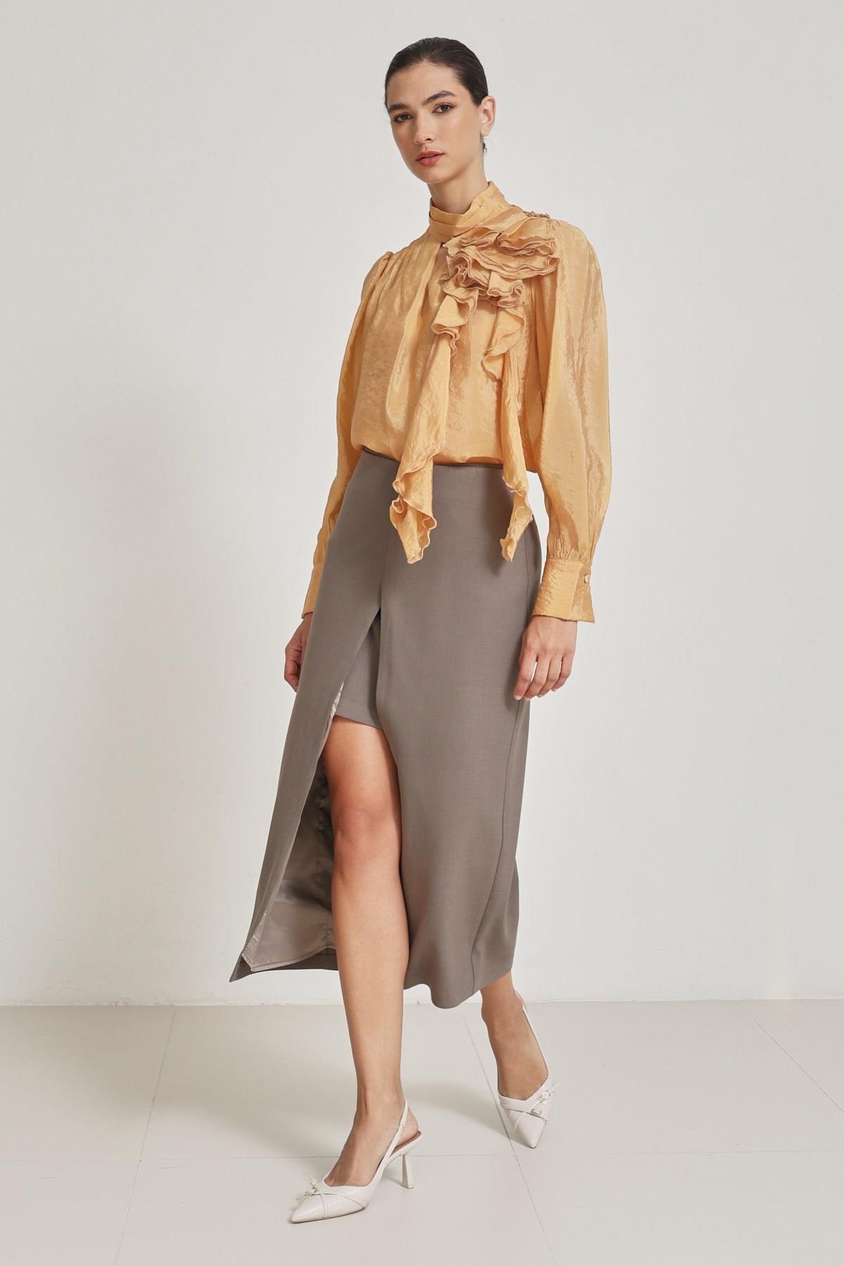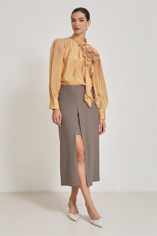 Zarif ve şık bir görünüm arayanlar için, yakada gül ve boyun detaylı uzun kollu bluz mükemmel bir seçenek. Hem sofistike hem de feminen bir hava taşıyan bu bluz, özel günlerden günlük kullanıma kadar her alanda şıklığınızı öne çıkaracak. Yakadaki gül detayı, tasarıma zarif bir dokunuş katarken, boyun detayı ise bluze sofistike bir hava ekler. Uzun kollu kesimiyle, hem şık hem de mevsim geçişlerinde rahatça kullanılabilir. Vücuda oturmayan rahat kesimi, gün boyu konfor sağlayarak stilinizi sergilemenize olanak tanır. Bu bluzu, şık bir etek ve topuklu ayakkabılarla özel davetlerde kullanabilir, jean ve rahat bir botla gündelik kombinlerinizde şıklığınızı tamamlayabilirsiniz. Ayrıca, bir blazer veya şık bir ceket ile ofis stilinizi oluşturabilirsiniz. Yakada gül ve boyun detaylı uzun kollu bluz, zarif ve özgün tasarımıyla gardırobunuza sofistike bir dokunuş katacak. Her adımda şıklığınızı sergileyin ve tarzınızı vurgulayın!