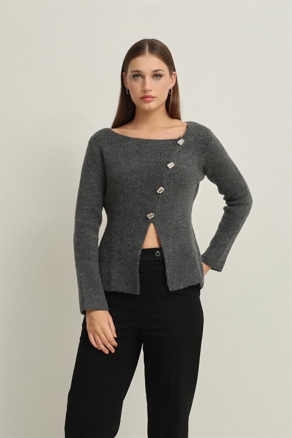Antrasit Asimetrik Düğme Detaylı Uzun Kollu Triko