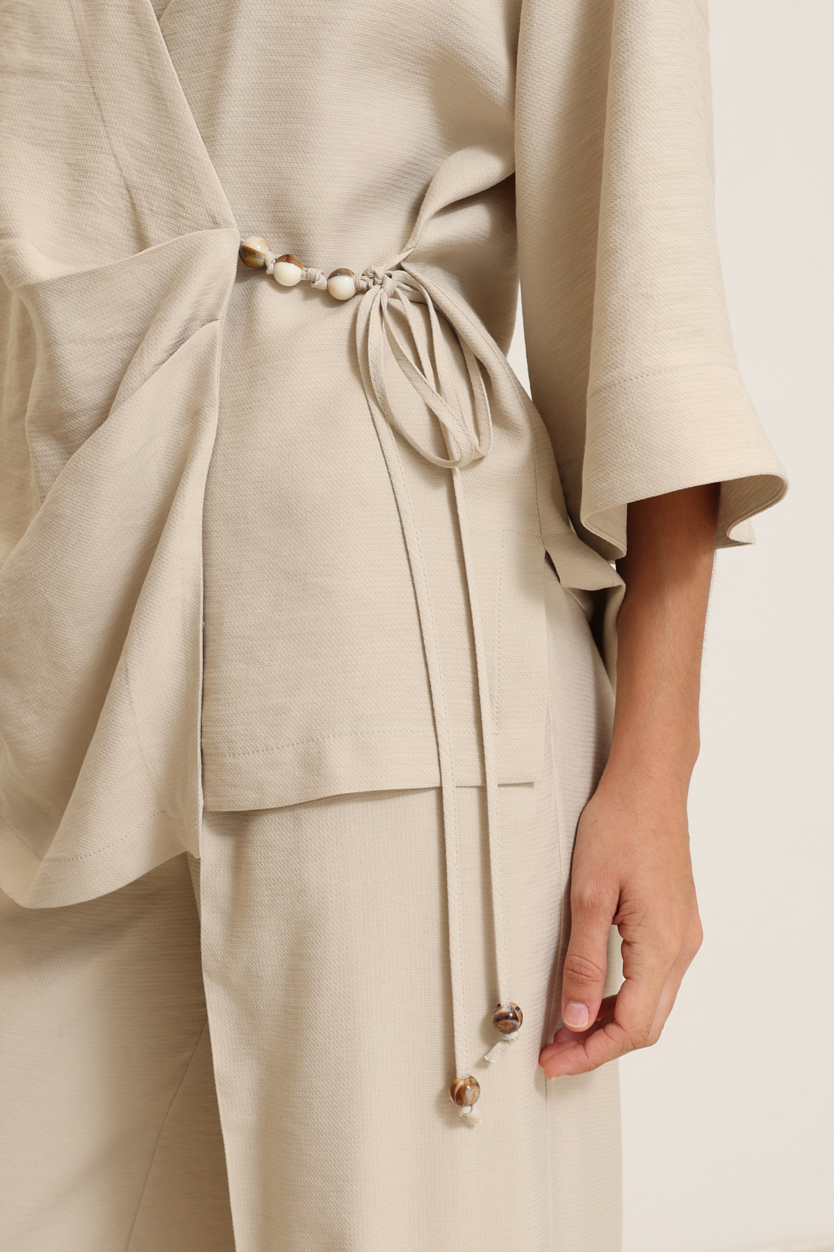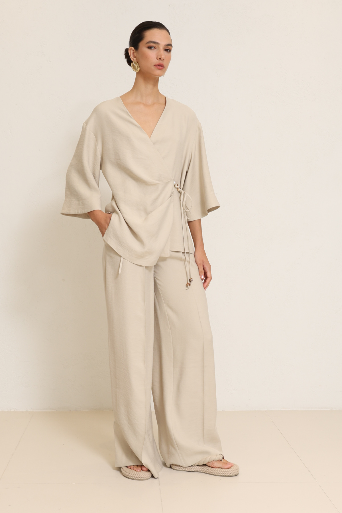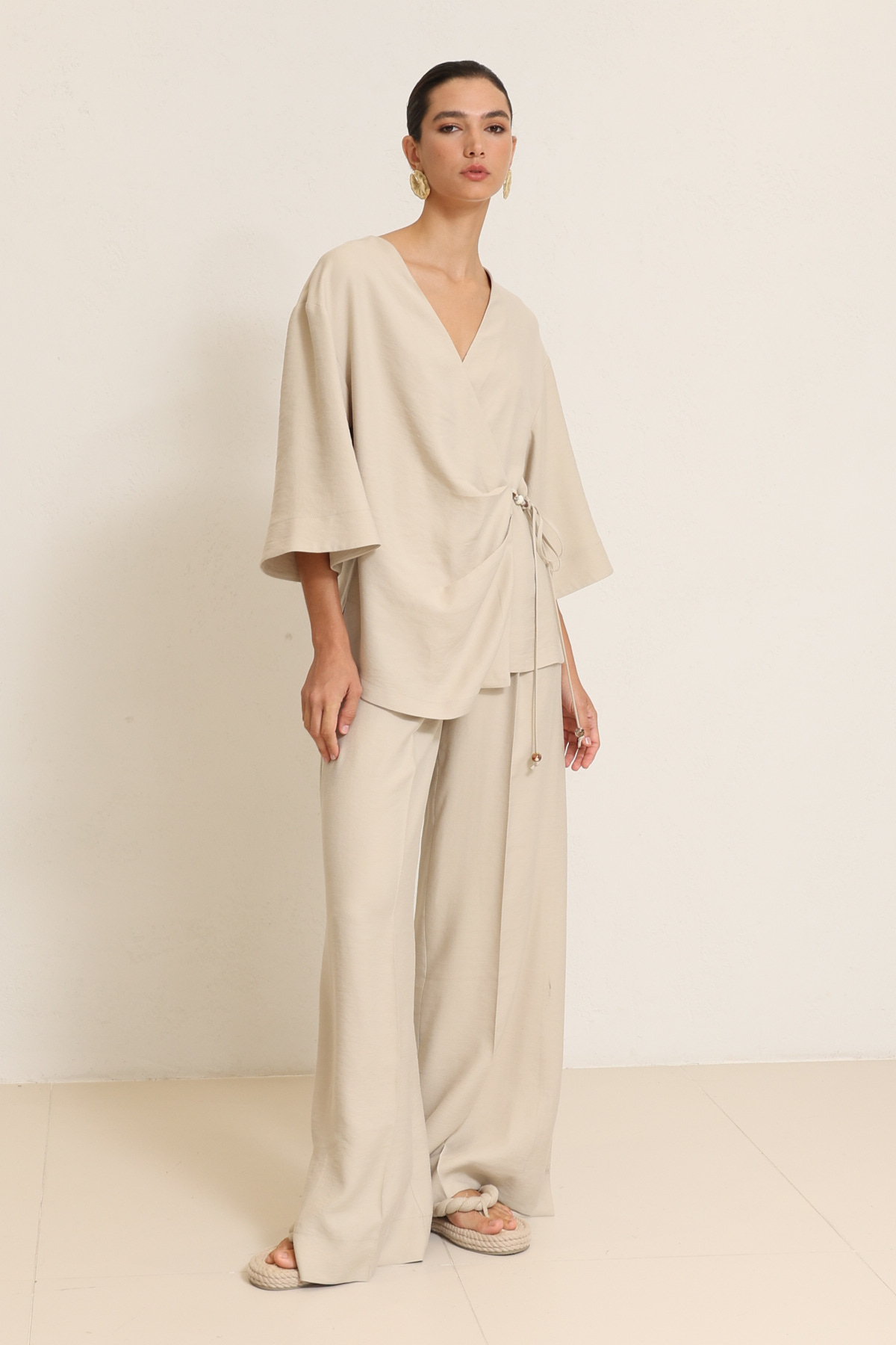 Kruvaze kapama ve aksesuar detaylarıyla tasarımına güçlü ve modern bir karakter kazandıran kimono, rahat kesim pantolonla tamamlanarak dengeli ve sofistike bir siluet oluşturur. Akıcı formlar gün boyu konfor sunarken, aksesuar vurguları stile çağdaş ve rafine bir ifade katar. Şehir stilinden şık davet kombinlerine kadar çok yönlü ve zamansız bir takım sunar.