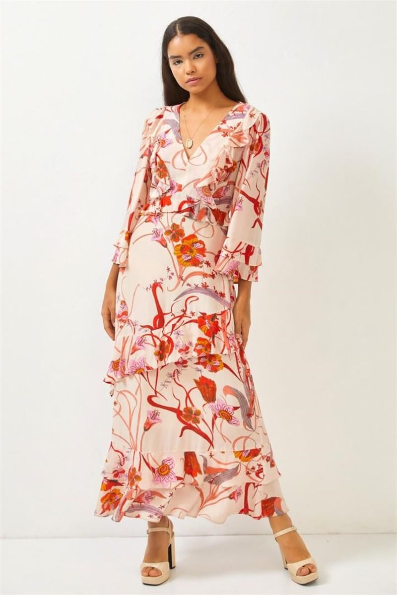Çiçek deseni ve volan detaylarıyla hareket kazanan elbise rahat formu, özel kumaş içeriğiyle şıklık ve konforu bir araya getiriyor.