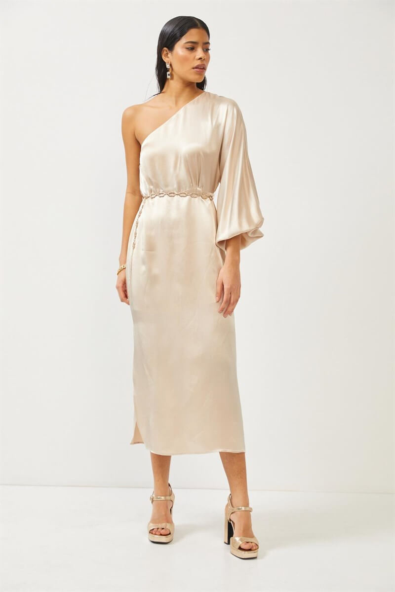 Davetlerde stiliniz ve şıklığınızla dikkat çekeceğiniz asimetrik zincir kemer detaylı elbisenin akışkan kumaşı ve kumaşının dokusu şıklığın yanısıra havalı ve kaliteli bir görünüm sağlıyor.