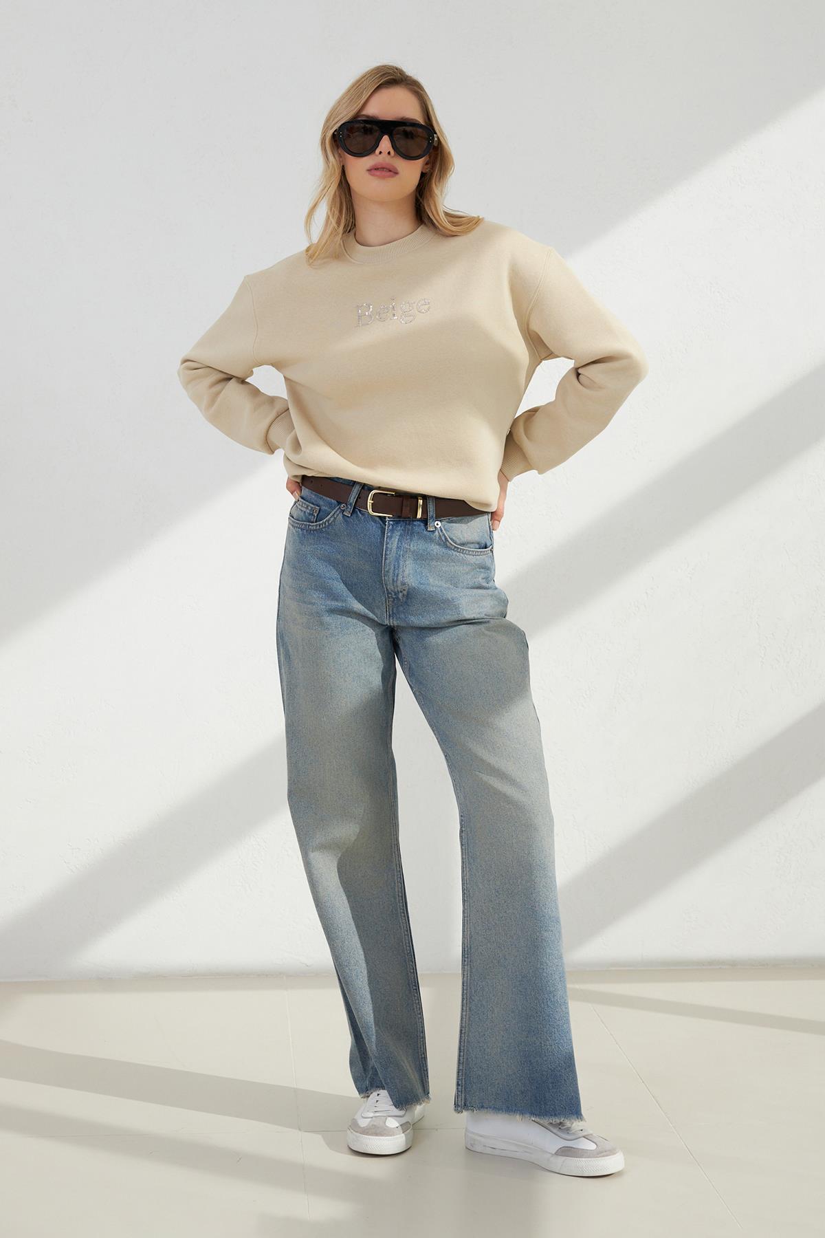 Bisiklet yaka baskı detaylı uzun kollu sweatshirt, günlük stilinize rahatlık ve şıklık katıyor. Yumuşak kumaşı ve oversize kesimiyle gün boyu konfor sağlarken, baskı detaylarıyla da sportif bir hava sunuyor. Hem spor aktiviteleri hem de şehirde geçireceğiniz rahat bir gün için ideal olan bu sweatshirt, jean veya eşofman altlarıyla mükemmel uyum sağlar. Şıklık ve rahatlığı bir arada sunan bu parça, gardırobunuzun vazgeçilmezi olacak.