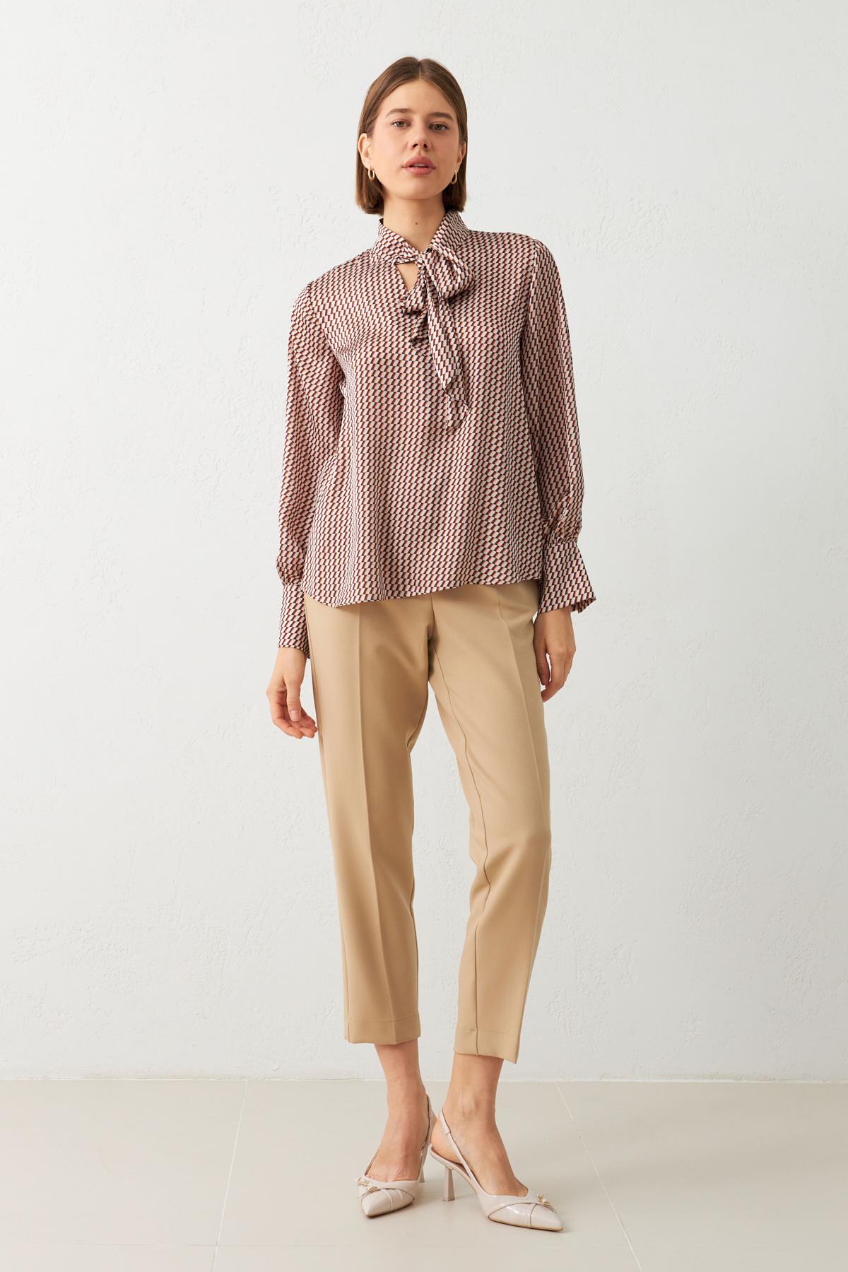 Boyundan bağlamalı uzun kollu desenli bluz, zarafeti ve rahatlığı bir arada sunan şık bir parçadır. Desenli kumaşı ile dikkat çekerken, boyundan bağlamalı detayı bluze ayrı bir hava katmaktadır. Hem günlük kullanımda hem de özel davetlerde tercih edilebilecek bu bluz, her mevsimde gardırobunuzun vazgeçilmezi olacak. Yumuşak ve nefes alabilen kumaşı ile gün boyu konfor sağlar. Farklı alt giyim seçenekleri ile kolayca kombinlenebilir, her ortama uyum sağlayacak bir tasarıma sahiptir.