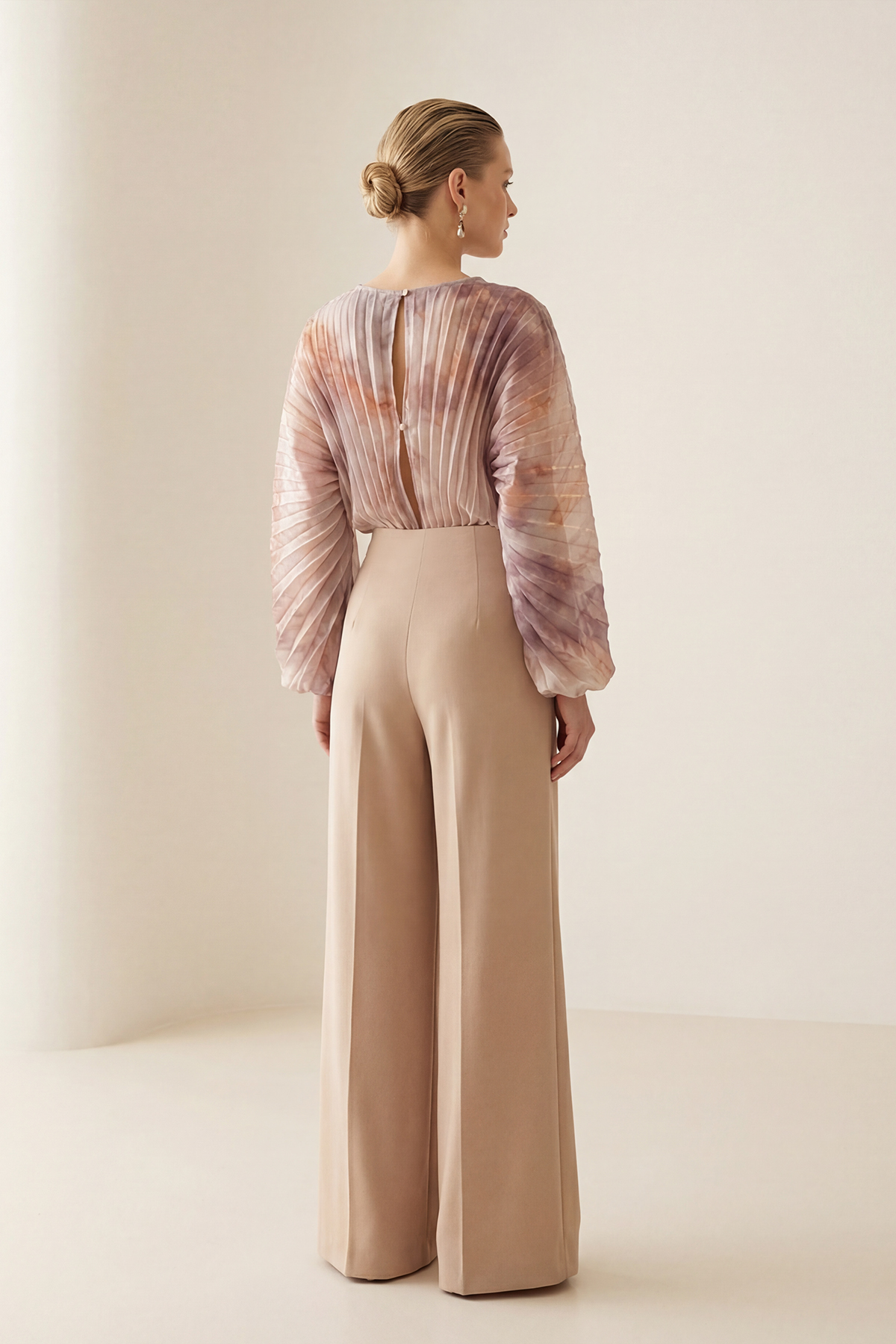Heykelsi silueti ve güçlü duruşuyla öne çıkan bu tulum, modern şıklığı iddialı detaylarla buluşturur. Üst bölümdeki pilise tasarım hacimli ve etkileyici bir form yaratırken, geniş paça kesimi denge ve zarafet sunar. Akıcı formu sayesinde hareket özgürlüğü sağlarken, sofistike görünümüyle özel davetlerden şehirli akşam stillerine kadar çok yönlü bir kullanım alanı sunar. Zamansız ve karakter sahibi bir stil arayanlar için güçlü bir alternatif.