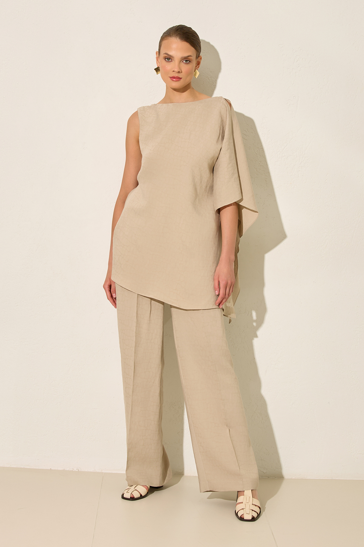 Rahat kesimiyle gün boyu konfor sunan bu pantolon, arka cep detaylarıyla tasarımına işlevsel ve modern bir dokunuş katar. Akıcı formu silueti doğal bir şekilde dengelerken, sade çizgileri şehirli ve zamansız bir stil yaratır. Günlük şehir kombinlerinden ofis stiline kadar çok yönlü ve kolay uyum sağlayan bir parçadır.