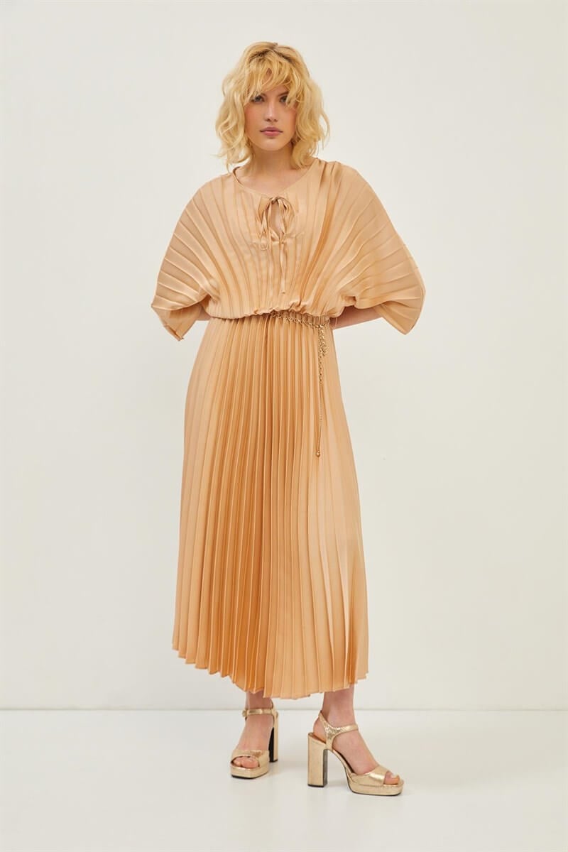 Davetlerde stiliniz ve şıklığınızla dikkat çekeceğiniz rahat kalıp formu ile konfor sağlayan zincir kemer detaylı elbisenin pilise detayları stilinize havalı ve kaliteli bir görünüm katıyor.