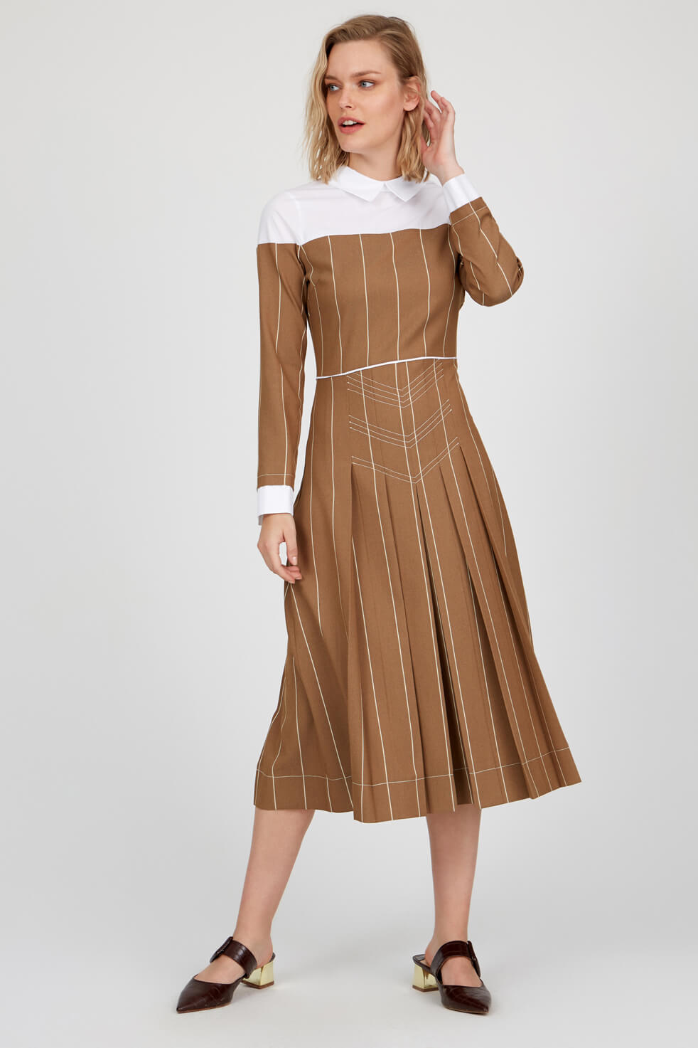 Bisküvi Gömlek Yaka Uzun Kol Midi Elbise