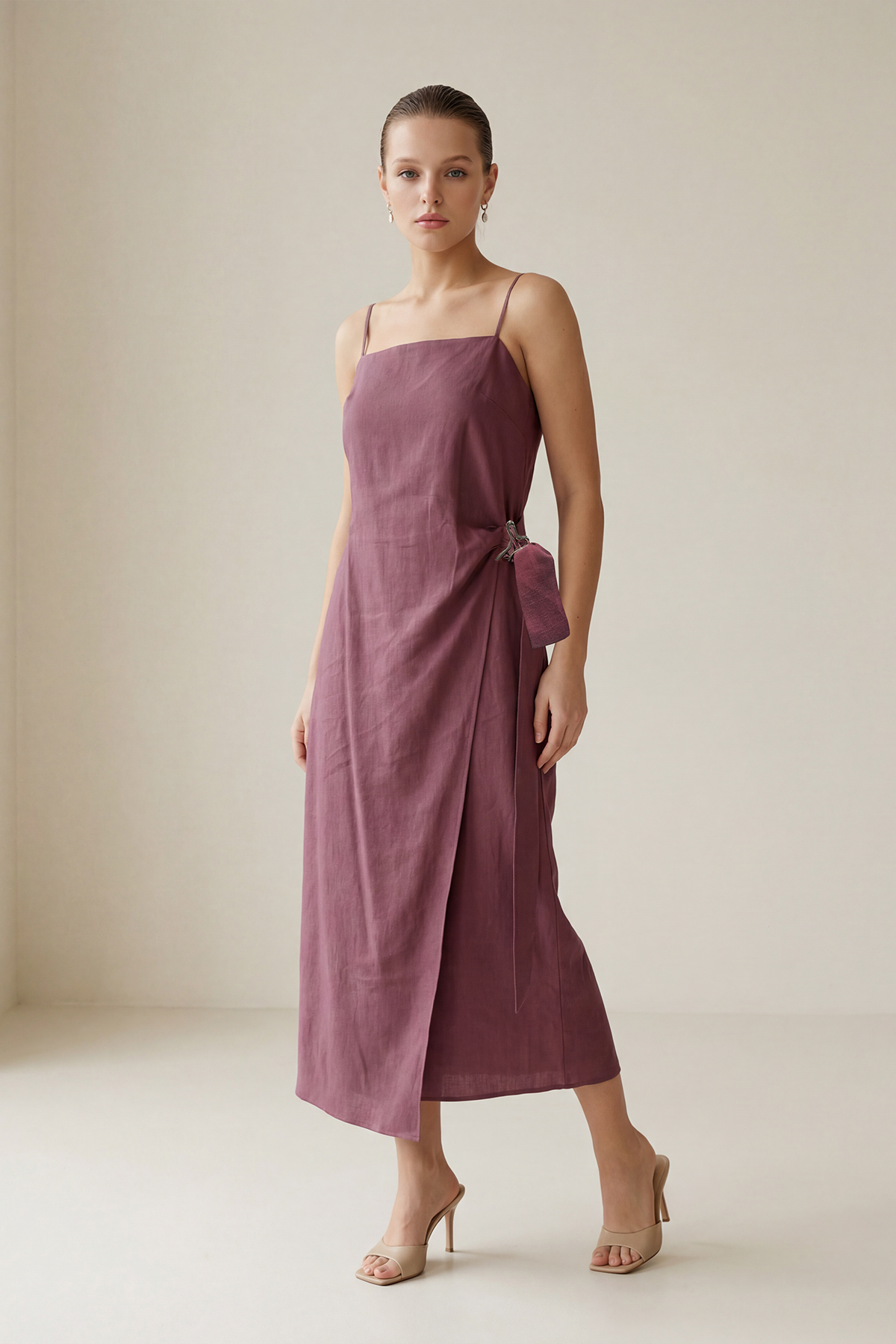 İnce askıları ve belden vurgulanan formuyla bu elbise, zarif bir feminen siluet sunar. Akışkan yapısı sayesinde vücuda doğal bir uyum sağlarken, bel detayı formu dengeli ve şık bir şekilde öne çıkarır. Günlük şıklıktan özel anlara uzanan kullanımıyla, sade ama etkileyici bir stil anlayışını yansıtır.