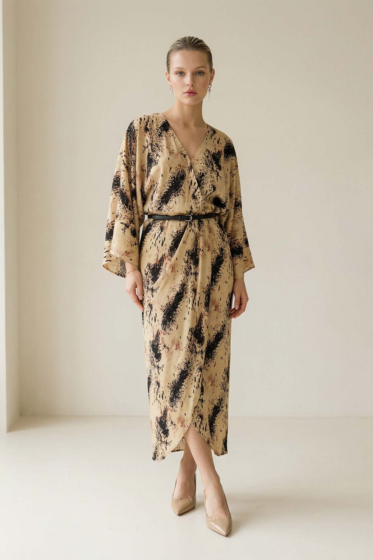 Belde yer alan kemer detayıyla silüeti dengeli bir şekilde vurgulayan bu midi boy elbise, desenli yüzeyiyle stile hareket kazandırır. Rahat kesimi gün boyu konfor sunarken, akıcı formu hem günlük kombinlerde hem de şehir stilinde modern ve zarif bir duruş sağlar. Zamansız ve kullanışlı bir gardırop parçası.