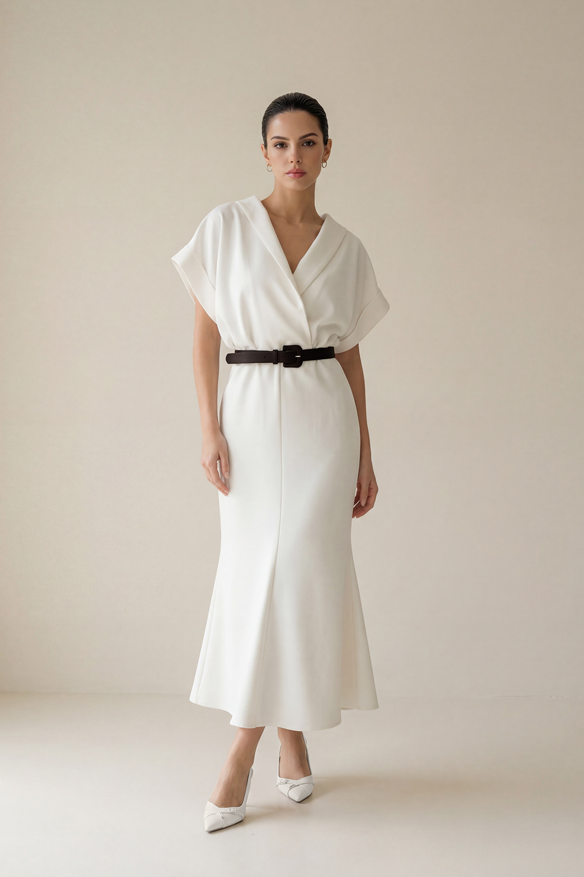 Zarif silueti ve akıcı formuyla öne çıkan bu elbise, modern feminen şıklığı güçlü bir duruşla buluşturur. Kruvaze yaka tasarımı üst bedende dengeli bir görünüm sunarken, belde yer alan kemer detayı silueti belirginleştirir. Kısa kollu kesimi ve uzun boyu sayesinde hem gündüz hem de akşam stiline kolayca uyum sağlar. Zamansız, sofistike ve çok yönlü bir gardırop parçasıdır. PREMIUM KUMAŞ VİSKON: Viskon doğal bir kumaştır. Yumuşak, hafif, parlak, hafif ve akışkan nefes alabilir özelliklere sahip olduğu için rahat giyim için kullanılır. Viskon ayrıca sıcakta serin tutma özelliği ile yazlık giysilerde tercih edilir.