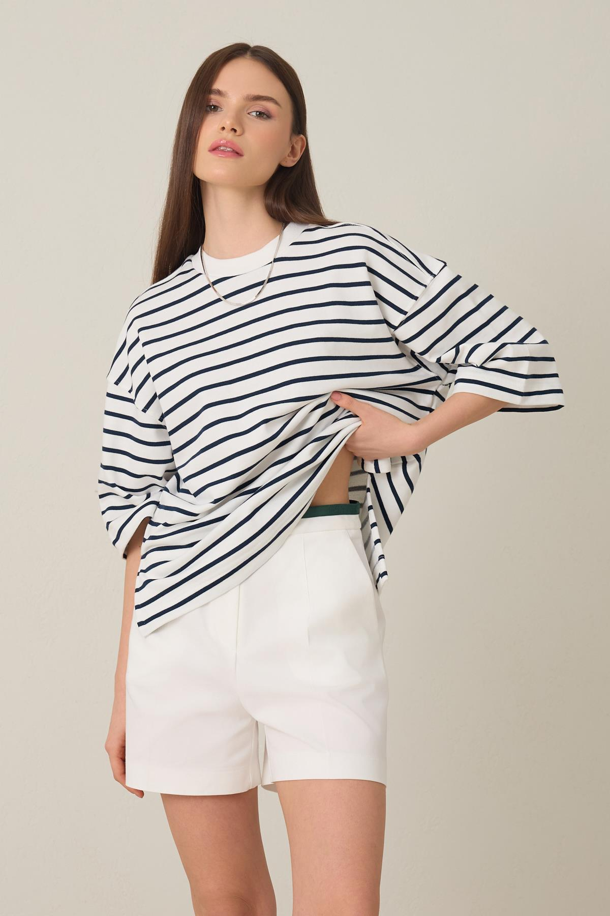 Ekru-Lacivert %100 Pamuk Çizgi Detaylı Kısa Kollu T-Shirt (ST20250S7146902)