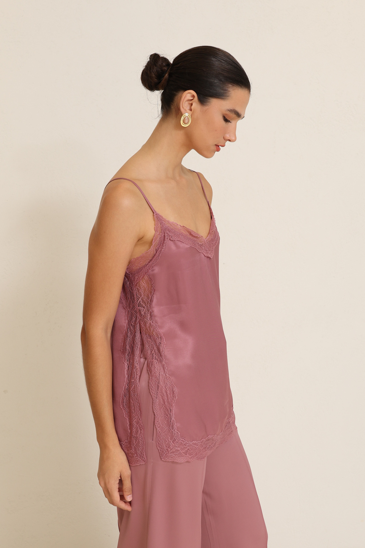 Zarif dantel detayıyla feminen bir duruş sergileyen bu askılı bluz, hafif ve dökümlü yapısıyla gün boyu konfor sunar. Rahat kesimi sayesinde vücuda nazikçe otururken, şık ve sade tasarımıyla hem günlük kombinlerde hem de özel anlarda kolaylıkla tercih edilebilir. Zamansız şıklığı modern bir yorumla buluşturan bu parça, gardırobun vazgeçilmez tamamlayıcılarından biri olmaya adaydır.