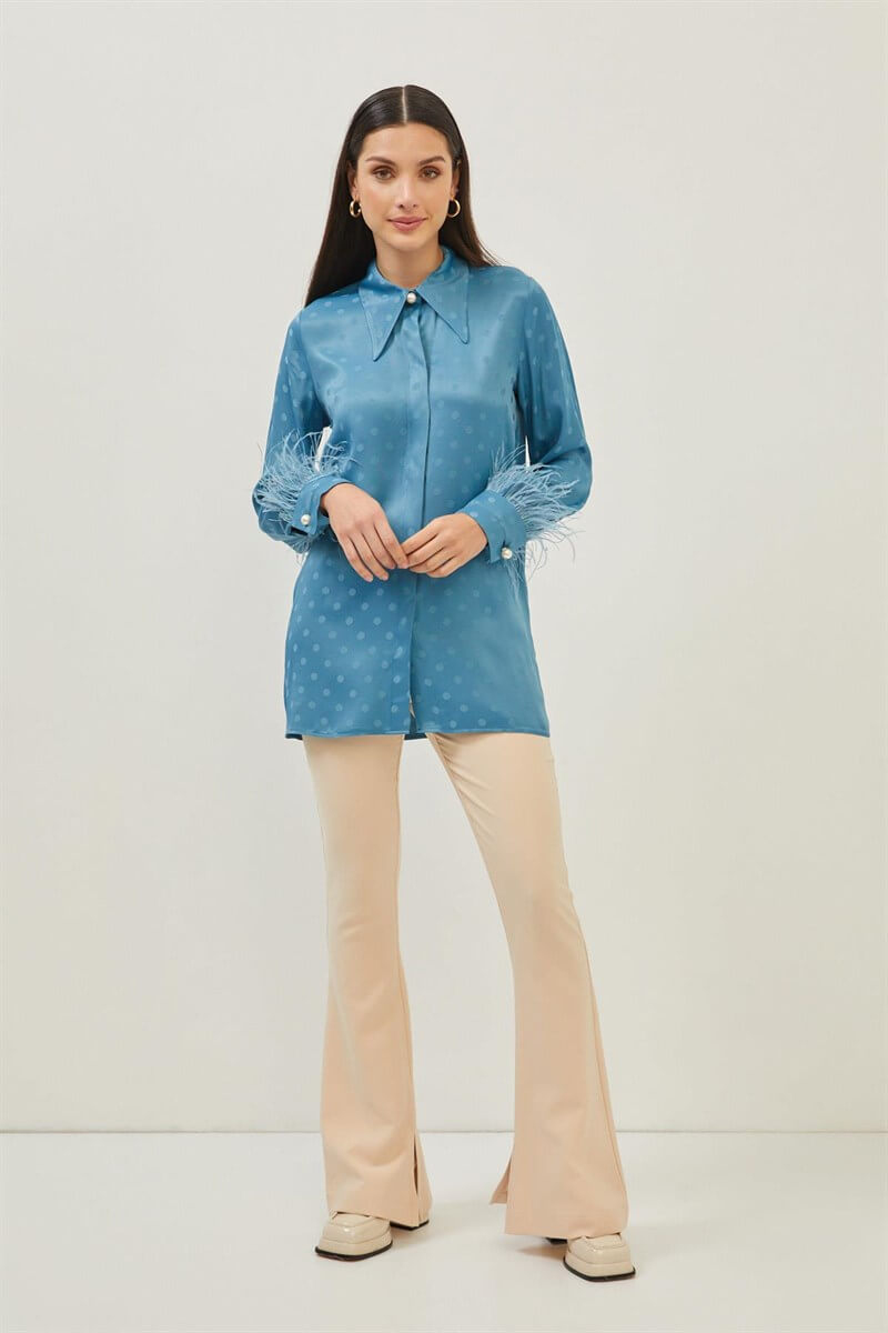 Gardıropların olmazsa olmazı basic gömlekler, incelikli ve yenilikçi detaylar ile güç kazanıyor. Kumaş kalitesi ve tüy detayı ile dikkat çeken gömleği, modern denim pantolonlar yada klasik pantolonların üzerinde tercih edebilirsiniz.