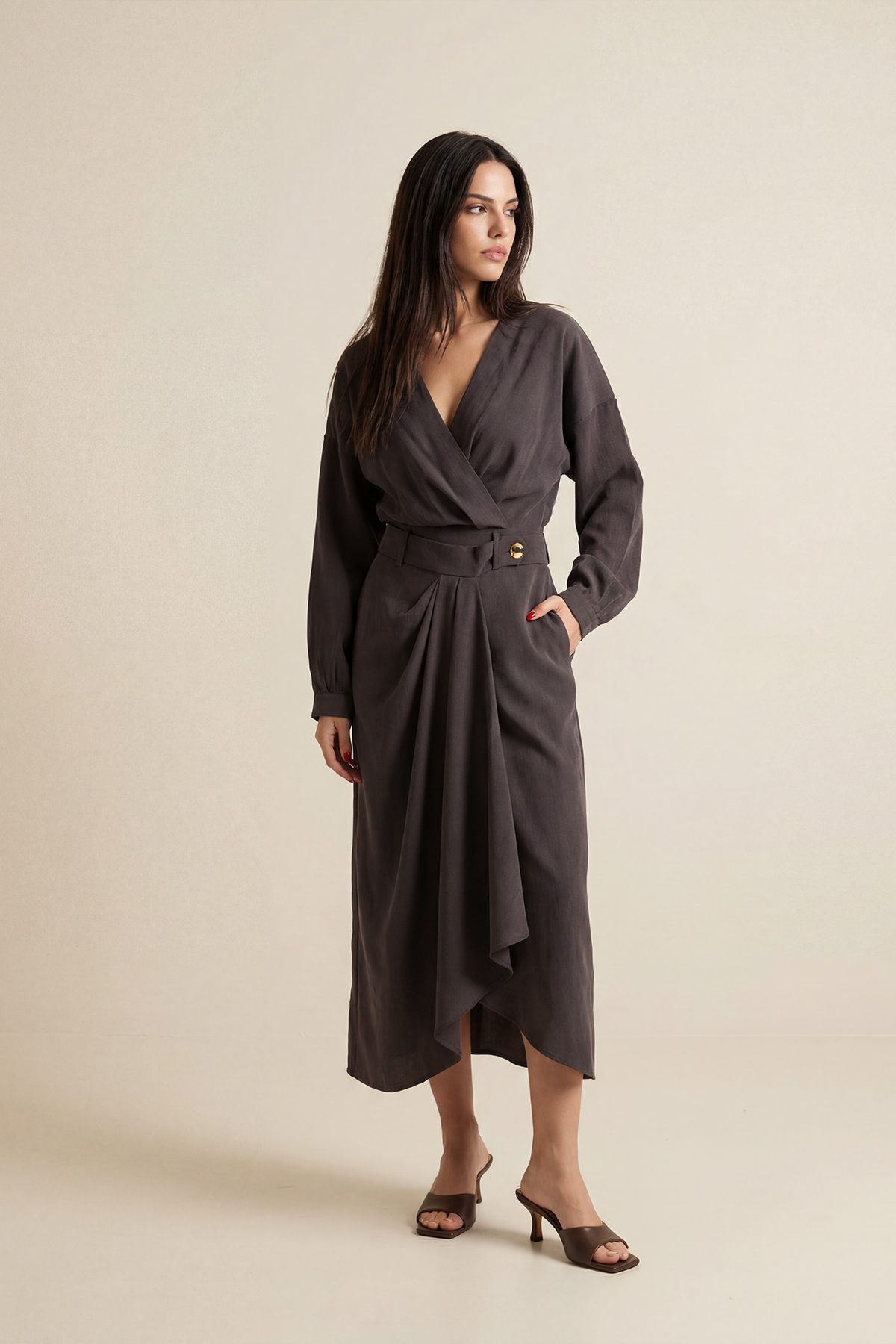 Bel kısmında yer alan düğme ve pile detaylarıyla tasarımına hareket kazandıran bu midi boy etek, feminen ve dengeli bir siluet sunar. Akıcı yapısı gün boyu konfor sağlarken, pilelerin yarattığı hacim stile zarif bir dinamizm katar. Günlük şehir kombinlerinden şık ofis görünümlerine kadar çok yönlü kullanım sunan zamansız bir parçadır.