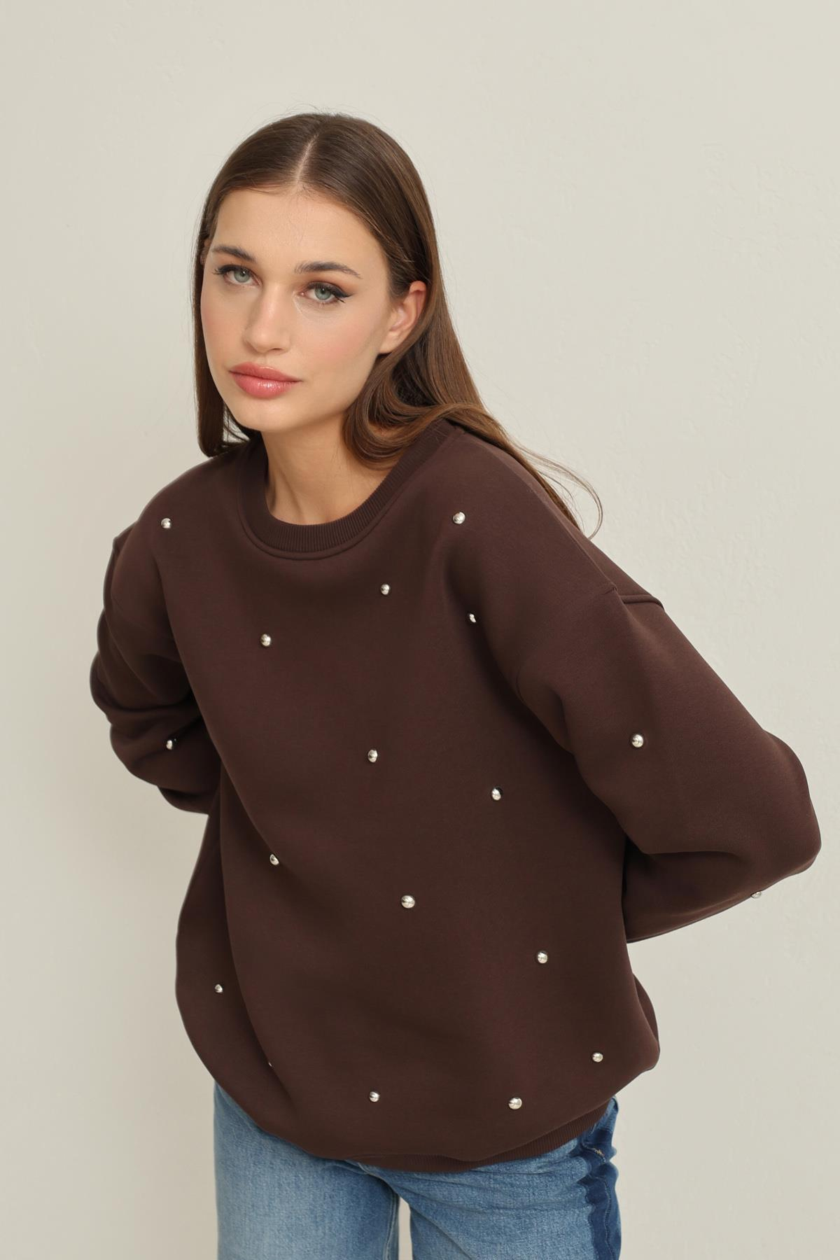 Kahve Bisiklet Yaka Taş Detaylı Uzun Kollu Sweatshirt Kadın Kategorisiz modelleri