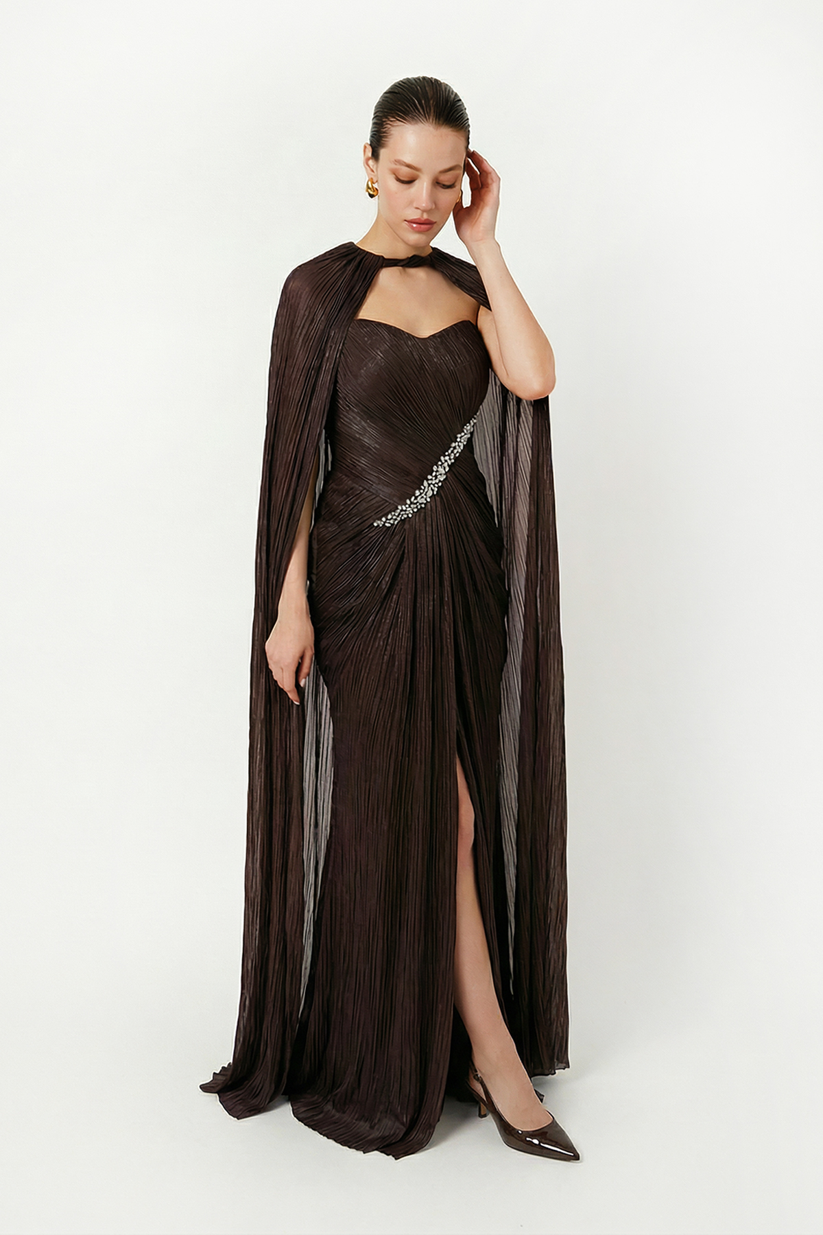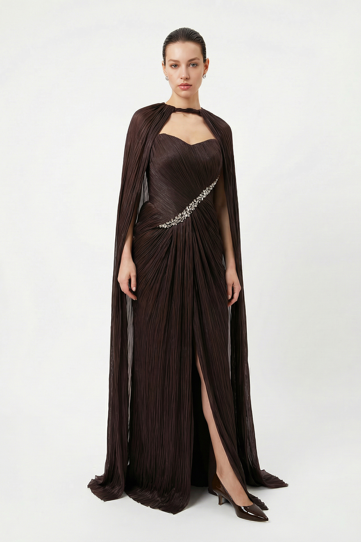 Kahve Straplez Yaka Detaylı Dökümlü Abiye Elbise