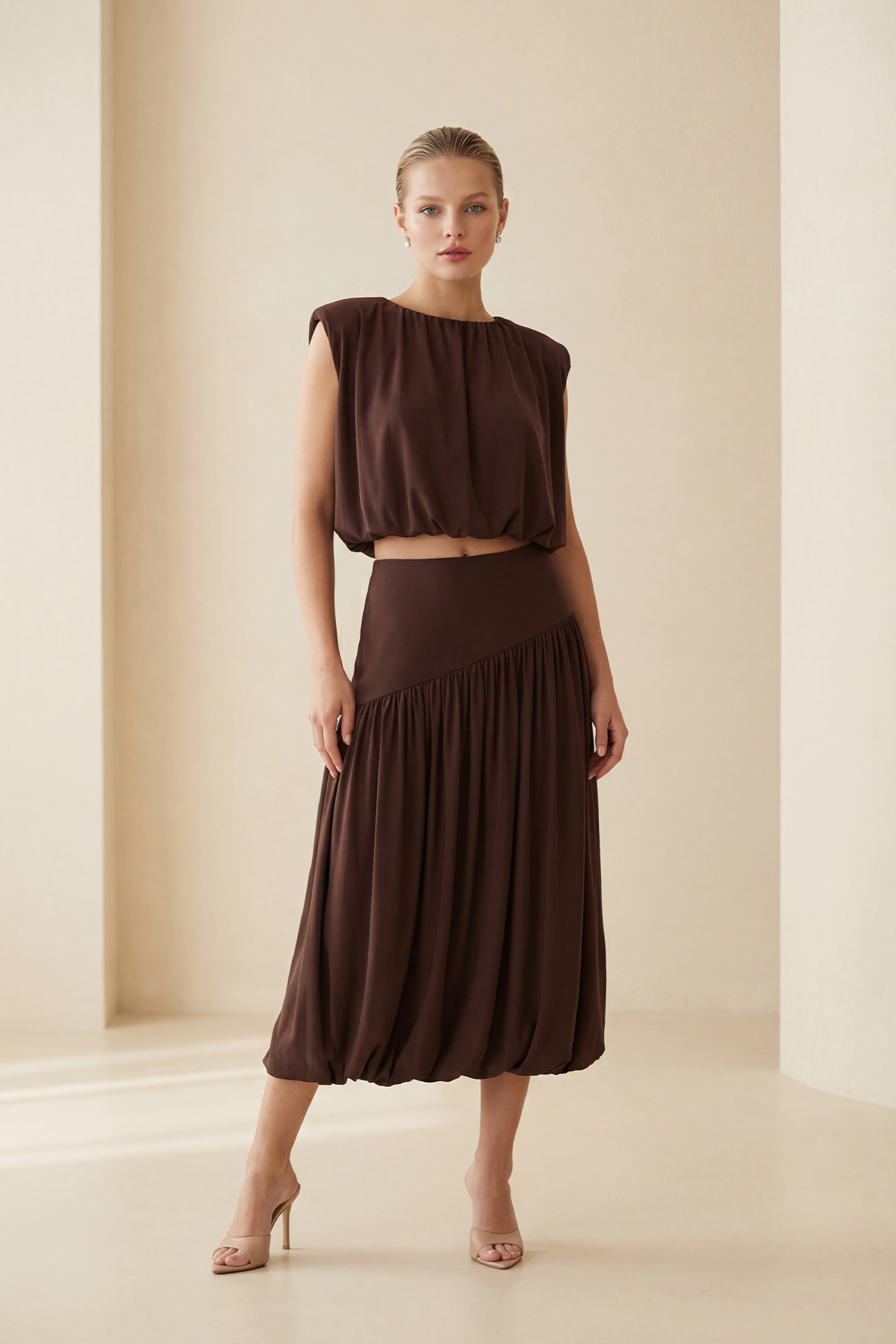 Kahverengi Dökümlü Bluz Pilise Detaylı Tam Kalıp Etek