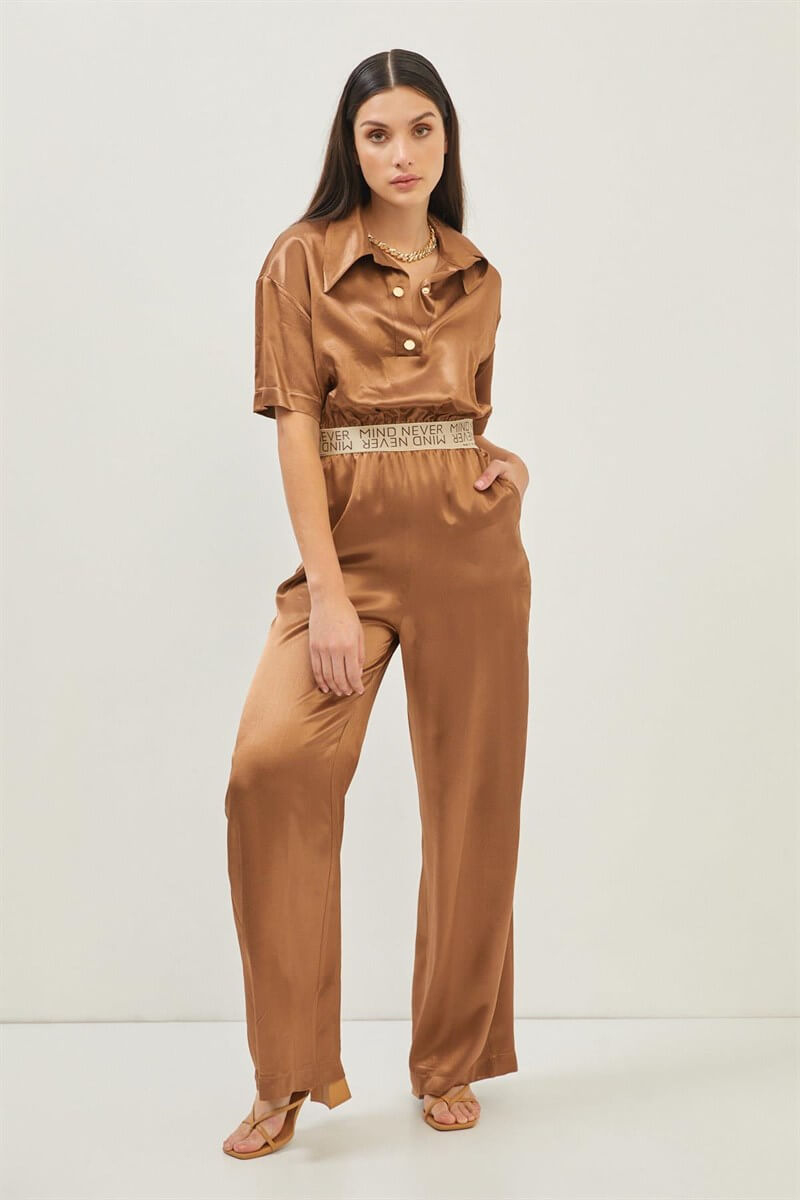Sezonun trendi olan saten görünüme sahip rayon kumaş içerikli bluz-pantolon ikili takımın şerit lastik aksesuar detayı konforlu bir şıklık kazandırıyor.