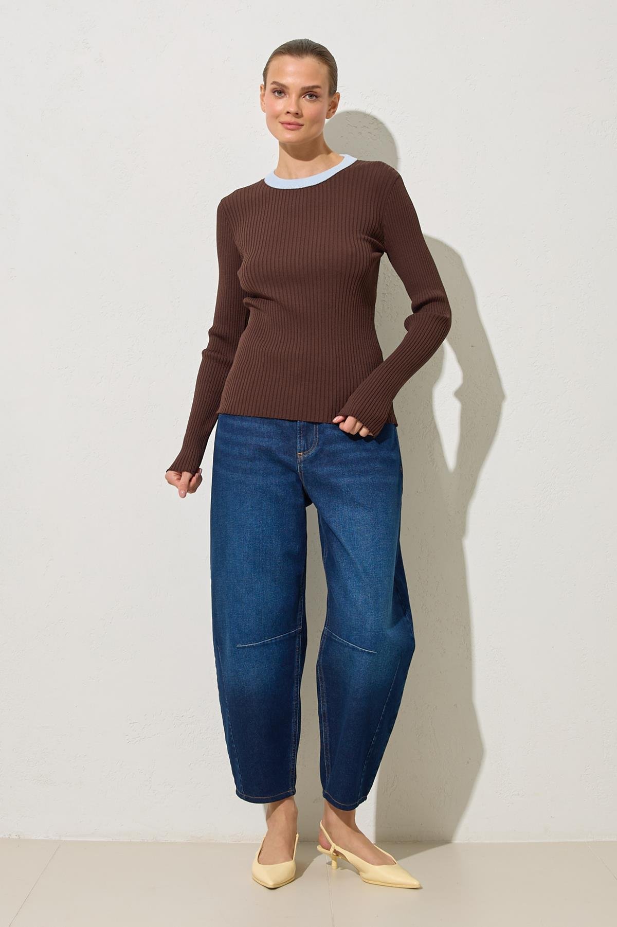Kahverengi Boyundan Şerit Detaylı Uzun Kollu Triko Bluz (ST20250W94421004)