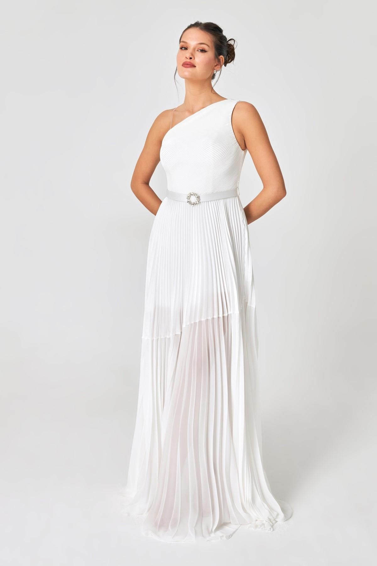 Tek Omuzlu, Belden Kemeri ve Etekten Transparan Detaylı Abiye Elbise ile zarafetin doruklarına çıkın. Bu abiye elbise, sofistike ve çekicilik arasında uyumlu bir denge sunarak özel yaz günleri için tasarlandı. Tek omuzlu stil, bir dokunuş glamur eklerken, beldeki kemer silueti sıkıştırır ve çekici, feminen bir görünüm yaratır. Etekten transparan detay ise merak uyandıran bir hava katarken, bu elbise unutulmaz anlar için dikkat çeken bir parça oluyor. Gala veya yaz davetiyesine katılıyor olsanız da, bu elbise zarafeti ve stili sorunsuz bir şekilde birleştiren büyüleyici bir seçenek.
