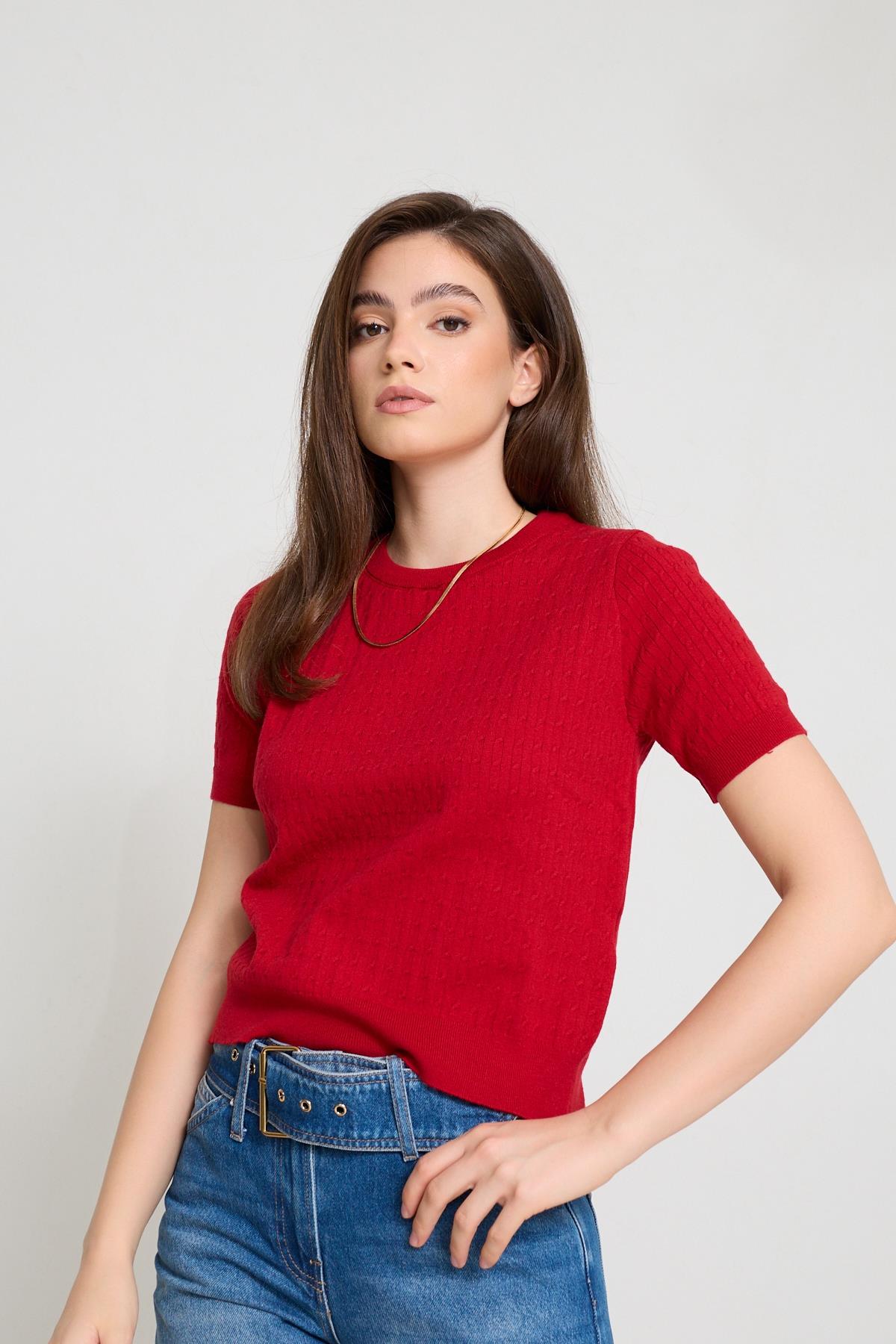 Kırmızı Bisiklet Yaka Kısa Kollu Triko Kadın Kategorisiz modelleri