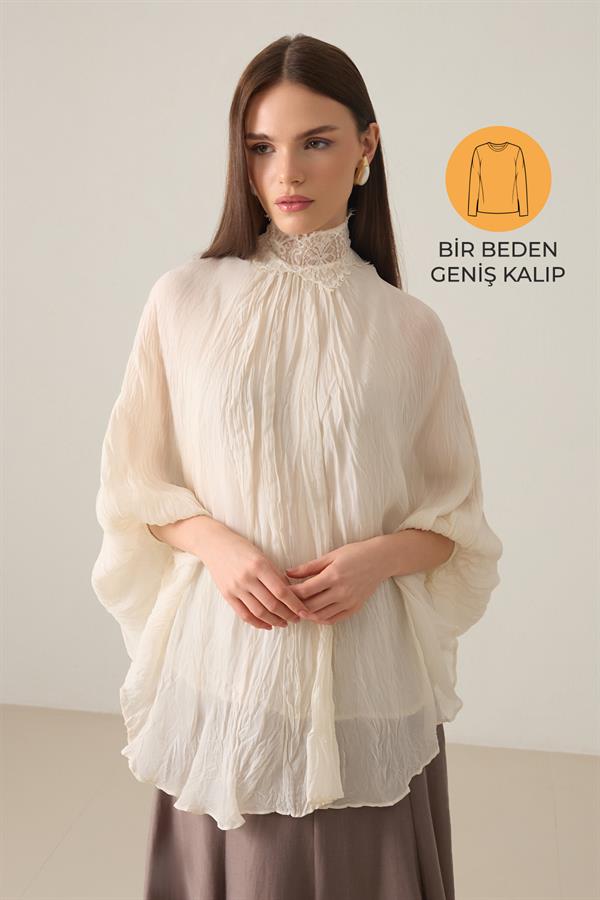 Stilinizi zarif ve rahat bir şekilde yansıtmak istiyorsanız, boyundan tül detaylı salaş rahat kesim bluz tam aradığınız parça! Hem şık hem de rahat tasarımıyla her an şıklığınızı ön plana çıkaran bu bluz, feminen detaylarla dolu bir seçenek. Boyundan bağlamalı tül detayı, zarif ve hafif bir hava katarak bluze sofistike bir görünüm kazandırır. Salaş ve rahat kesimi ise hem konforu arttırırken hem de şıklığı gündelik hayata taşır. Tül detayları, transparan dokusuyla özgün ve modern bir etki yaratırken, rahat kesim vücudu sarmadan şıklığınızı sergiler. Bu bluzu, şık bir pantolon ve topuklu ayakkabılarla akşam şıklığınıza zarif bir dokunuş katabilir, rahat bir jean ve sneakers ile gündelik stilinize rahatça dahil edebilirsiniz. Ayrıca, üzerine şık bir ceket veya hırka ekleyerek katmanlı bir görünüm oluşturabilirsiniz. Boyundan tül detaylı salaş rahat kesim bluz, zarafeti ve rahatlığı bir arada sunarak her an stilinizi yansıtır. Gardırobunuzda bu şık tasarımı keşfedin ve şıklığınızı her adımda sergileyin!