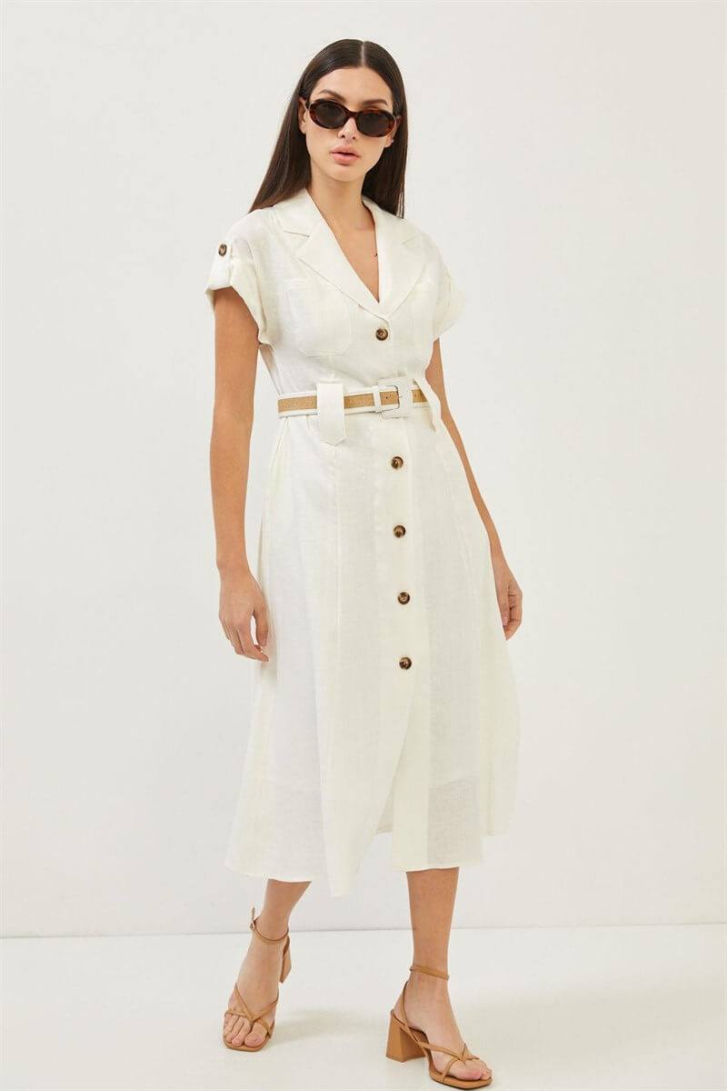 Krem Kemer Detaylı Düğme Kapamalı Kruvaze ElbiseST070S40148001