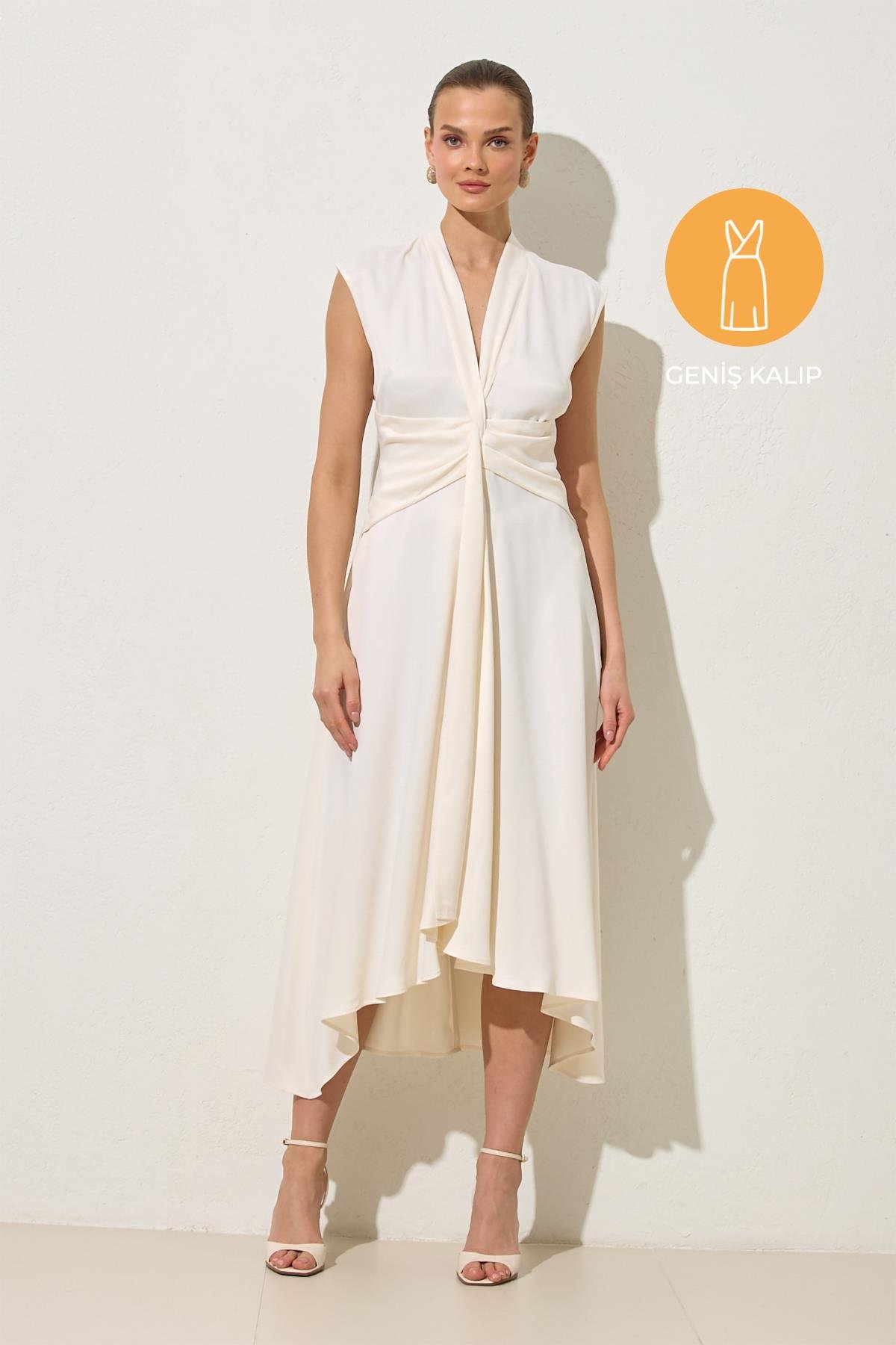 Şıklığı ve zarafeti bir arada sunan V yaka belden detaylı midi boy kolsuz elbise, modern ve sofistike bir görünüm elde etmek isteyenler için ideal bir tercihtir. V yaka detayı, boyun bölgesini zarif bir şekilde vurgulayarak, zarif bir siluet oluşturur. Bel kısmındaki detay ise, vücudu güzel bir şekilde sarar ve ince bir görünüm sağlar. Midi boy kesimi, hem şık bir havası hem de rahatlığıyla dikkat çeker, hem gündüz hem de akşam etkinliklerinde rahatlıkla tercih edilebilir. Kolsuz yapısı, yaz aylarında şıklığına şıklık katarken, katmanlı aksesuarlarla da kombinlenebilir. Hem şık hem rahat bir stil arayanlar için mükemmel bir elbise seçeneğidir.