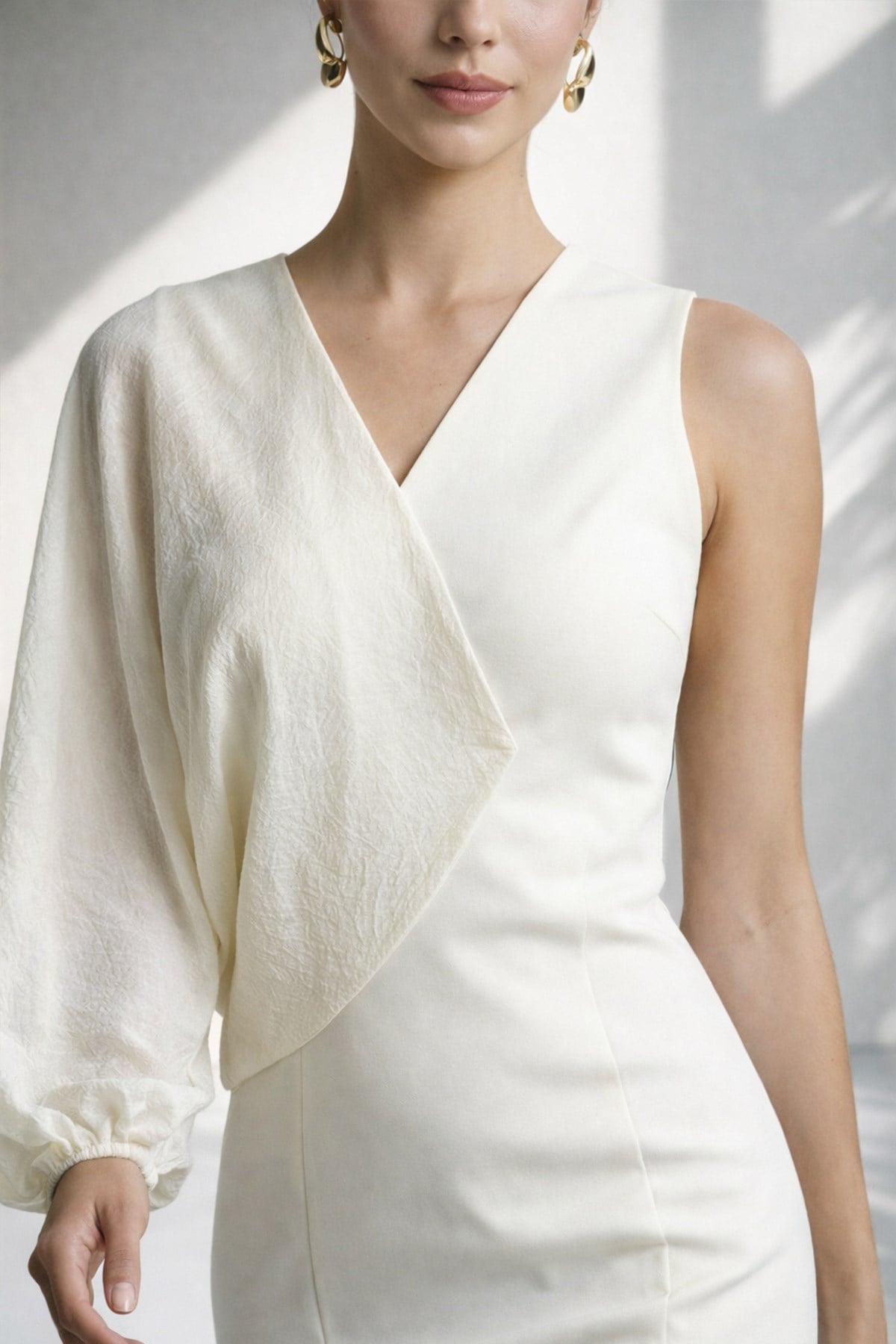 V yaka ve tek omuz tasarımıyla modern ve iddialı bir siluet sunan bu elbise, asimetrik kumaş detayıyla tasarımına özgün bir dinamizm katar. Akıcı formu vücut hatlarını zarifçe dengelerken, güçlü çizgileri stil sahibi bir duruş yaratır. Özel davetlerden akşam organizasyonlarına kadar fark yaratan bir görünüm sunar.