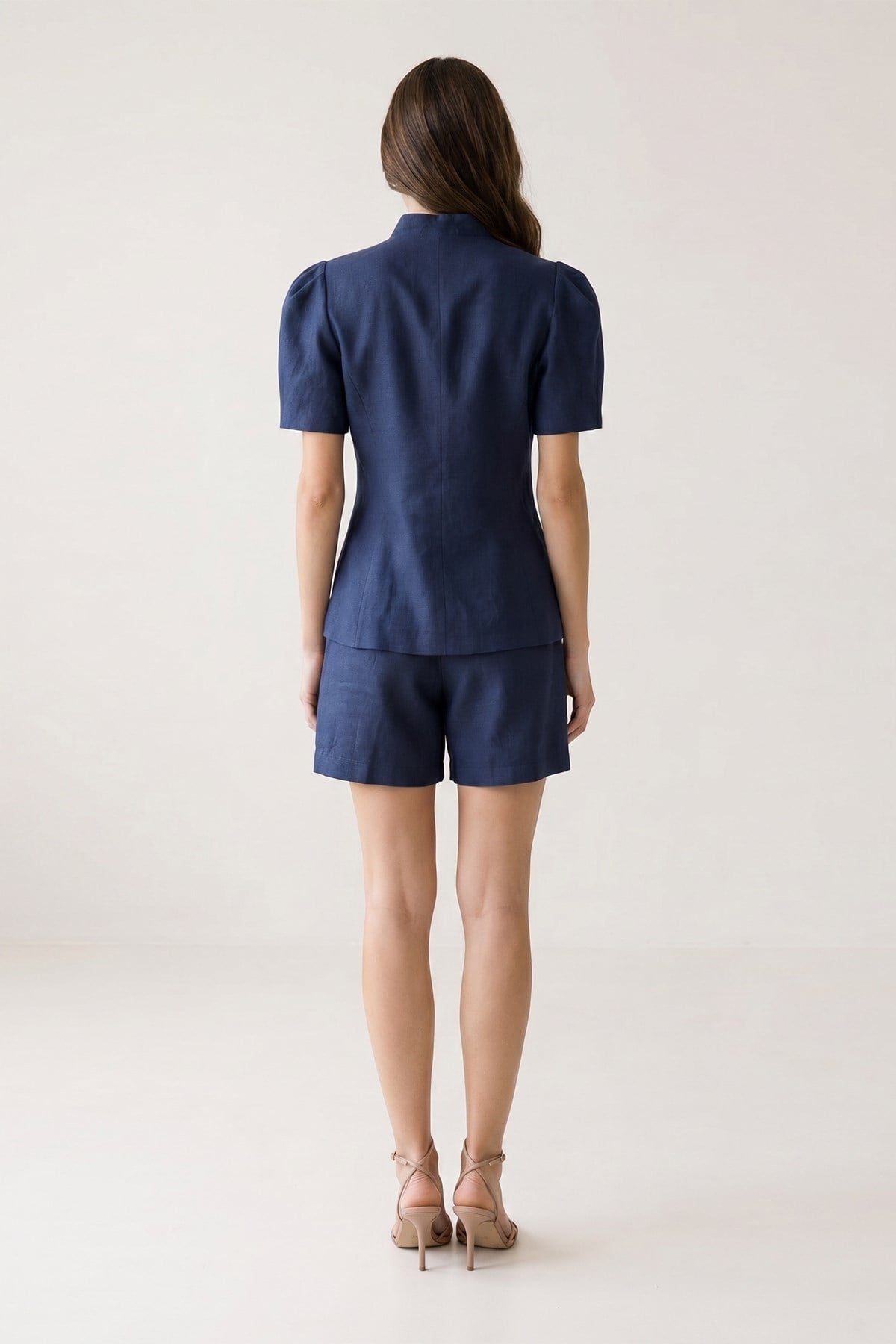Lacivert %100 Keten Yaka Ve Kol Detaylı Düğmeli Kısa Kollu Ceket (ST20260S1709921)