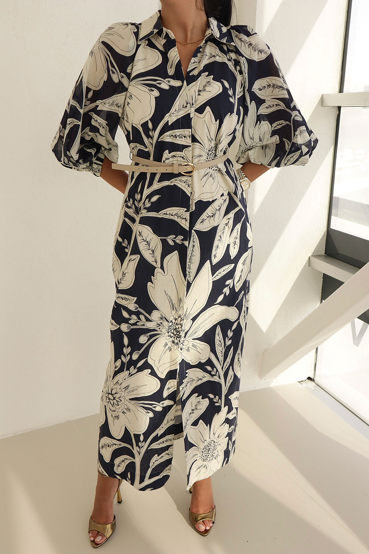 Lacivert Gömlek Yaka Uzun Kollu Belden Kemerli Uzun Boy Desenli Geniş Kalıp Elbise