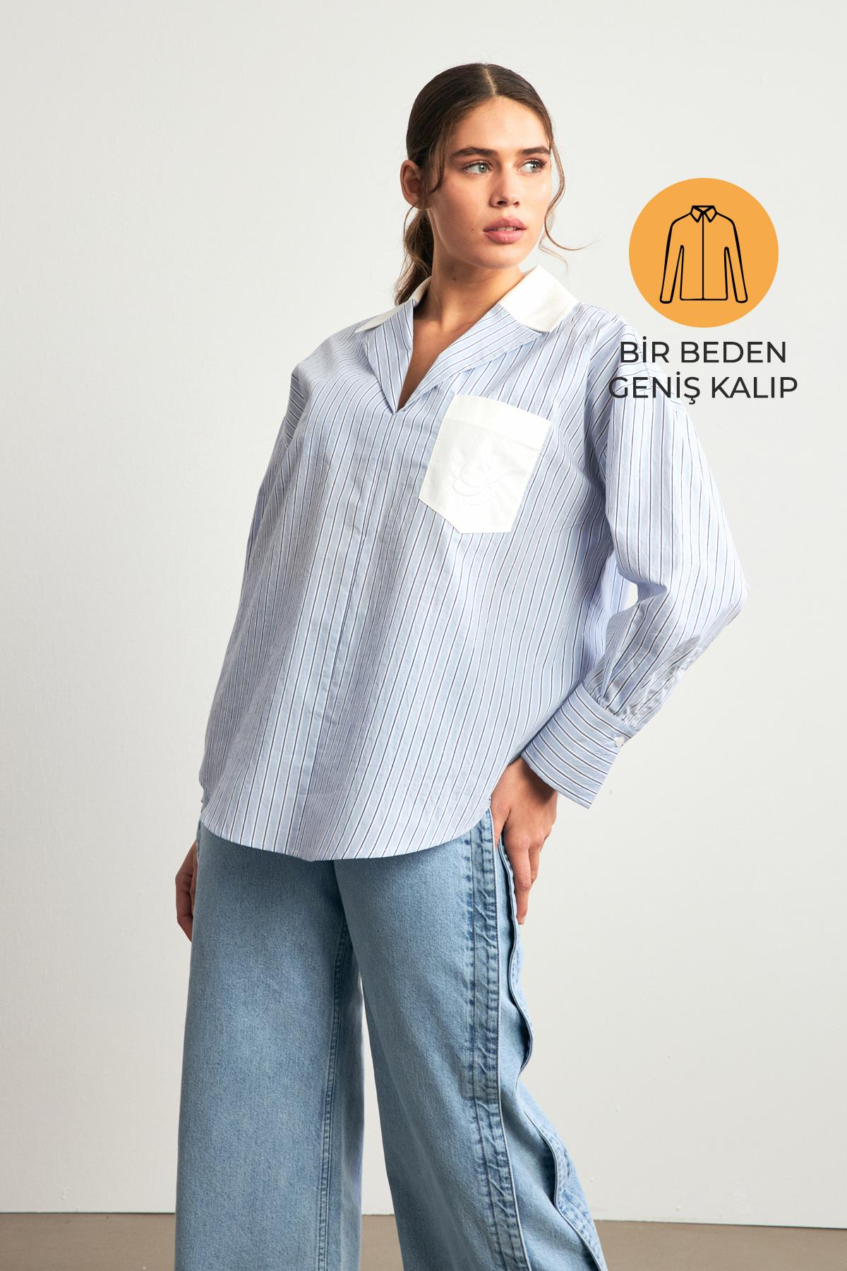 V yaka, cep detaylı çizgili gömlek, modanın fonksiyonel ve şık bir birleşimini sunuyor. Çizgili desen, klasik ve modern çizgiler arasında dengeli bir geçiş sağlayarak, her ortamda şıklığınızı korumanıza yardımcı olur. V yaka detayı, bu gömleğe zarif bir görünüm kazandırırken, aynı zamanda boyun bölgesini uzatır ve ince bir siluet oluşturur. Cep detayları ise sadece estetik bir ek değil, aynı zamanda kullanışlılık sağlar. Günlük ihtiyaçlarınızı taşıyabileceğiniz bu pratik detay, modern yaşamın hızına uyum sağlar. Bu gömlek, hem ofis ortamında profesyonel bir görünüm elde etmenizi sağlar hem de hafta sonu gezileri için rahat bir seçenek sunar. Gömleği, klasik bir kumaş pantolon veya şık bir etekle kombinleyerek sofistike bir görünüm elde edebilir, ya da jeanlerle daha rahat bir stil yaratabilirsiniz. Her iki durumda da, V yaka ve cep detayları ile dikkat çeken bu gömlek, gardırobunuzun vazgeçilmez bir parçası olacaktır.