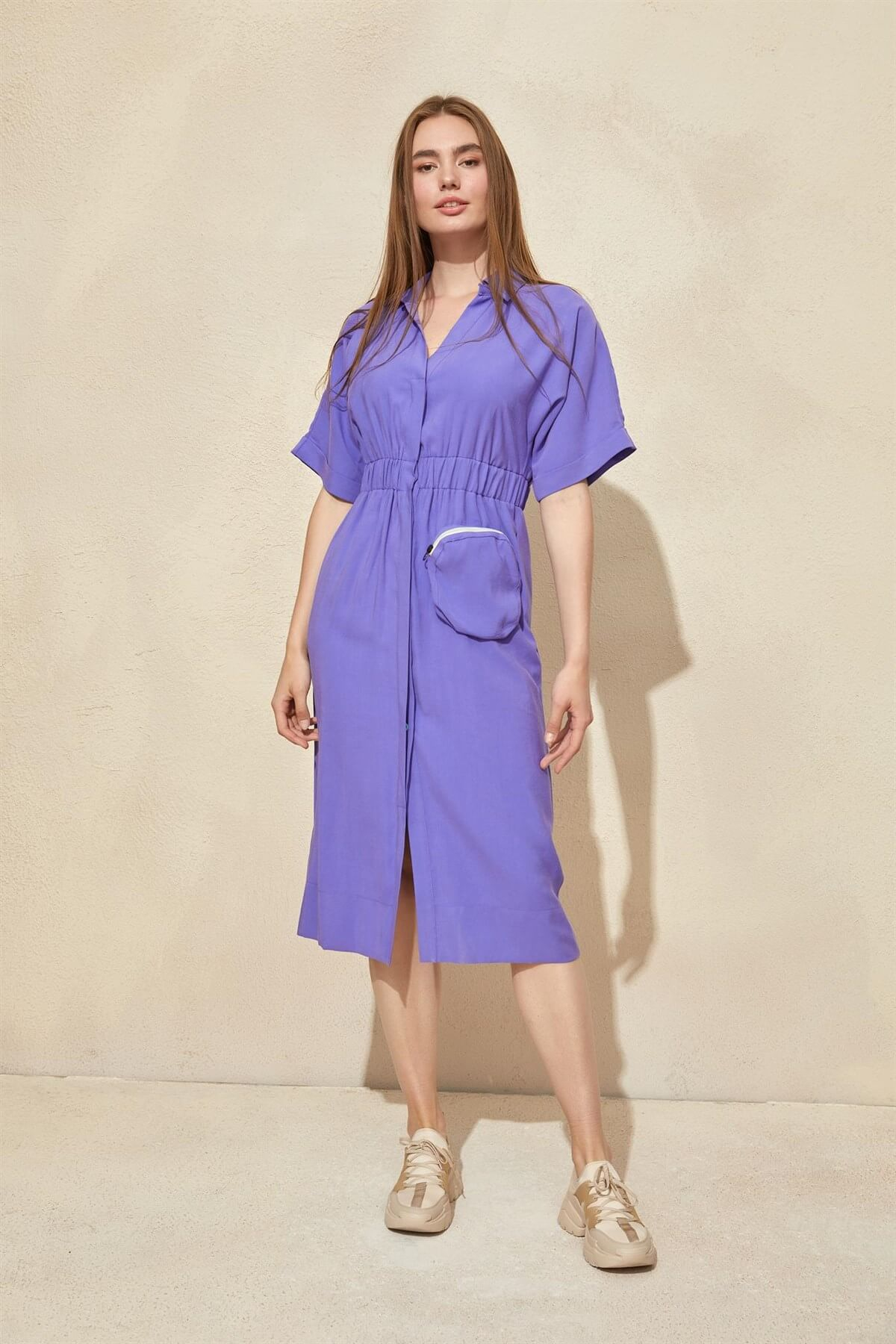 Beli lastikli midi elbise cep detayıyla spor bir görüntü sunuyor. Spor ayakkabılarınızla rahatlıkla kombinleyebilirsiniz.