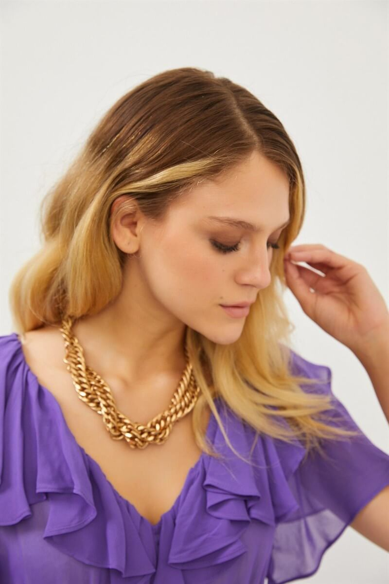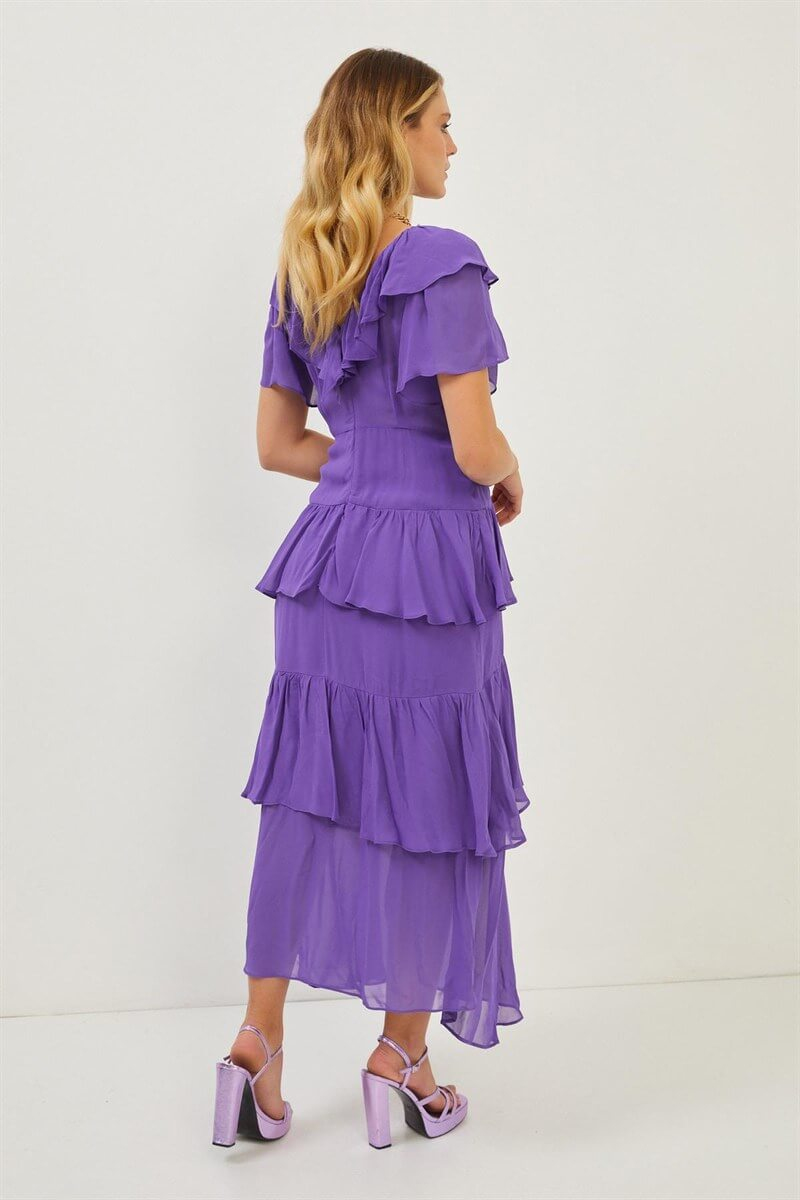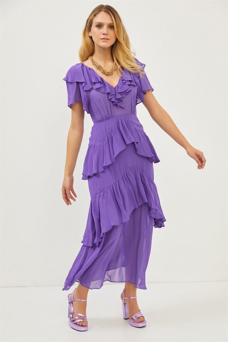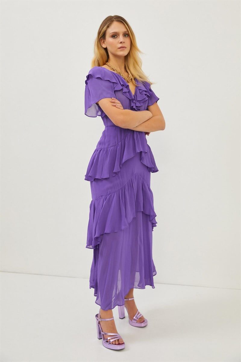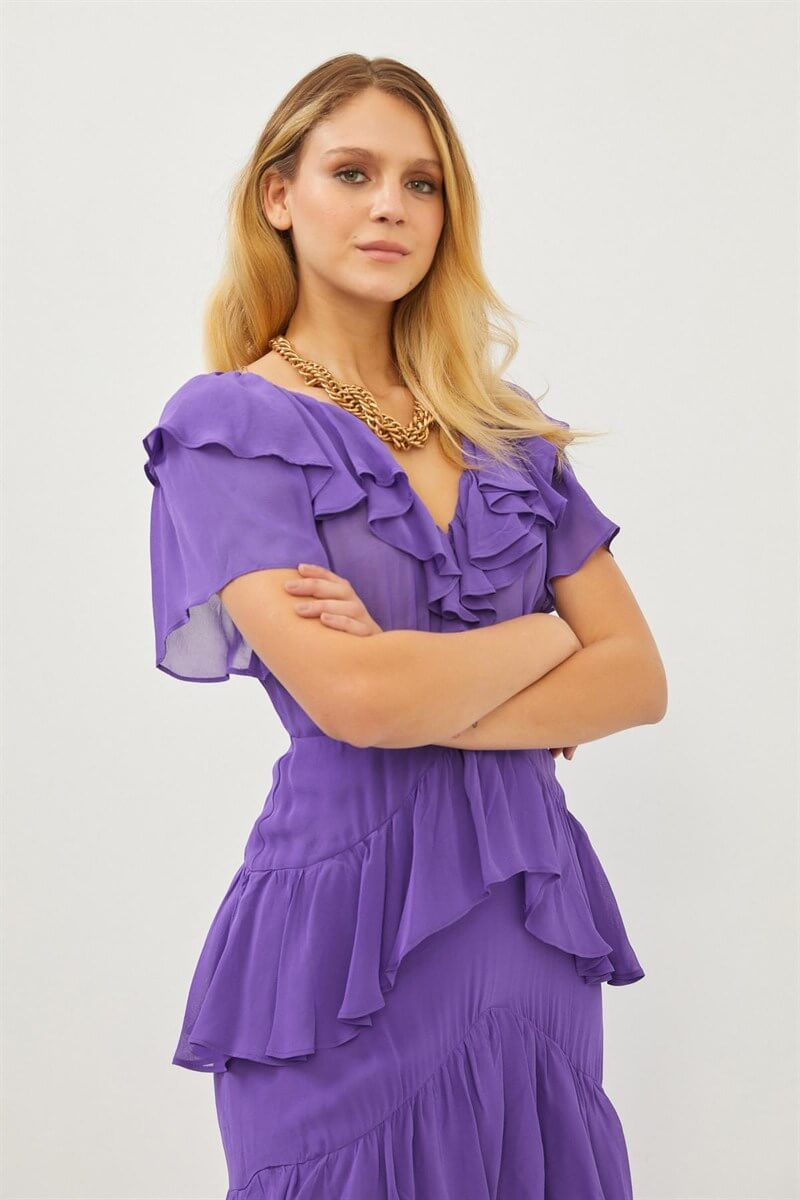 Özel kumaş içeriğine sahip midi boy v yakalı elbisenin volan detayları romantik ve havalı bir görünüm sunuyor. Gösterişli küpeler ve sezonun trendi kalın topuklu terliklerinizle kombininizi tamamlayabilirsiniz.