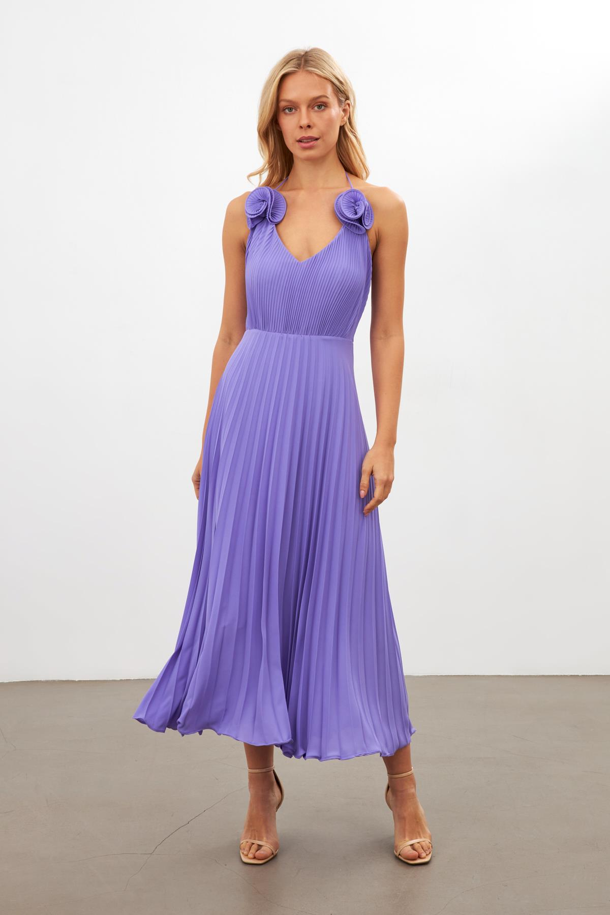 Çiçek detaylarıyla süslenmiş pliseli ve V yaka kesimli bu midi boy elbise, zarif ve romantik bir görünüm sunuyor. Özel günlerde ve davetlerde stilinize zarafet katmak için mükemmel bir seçim.