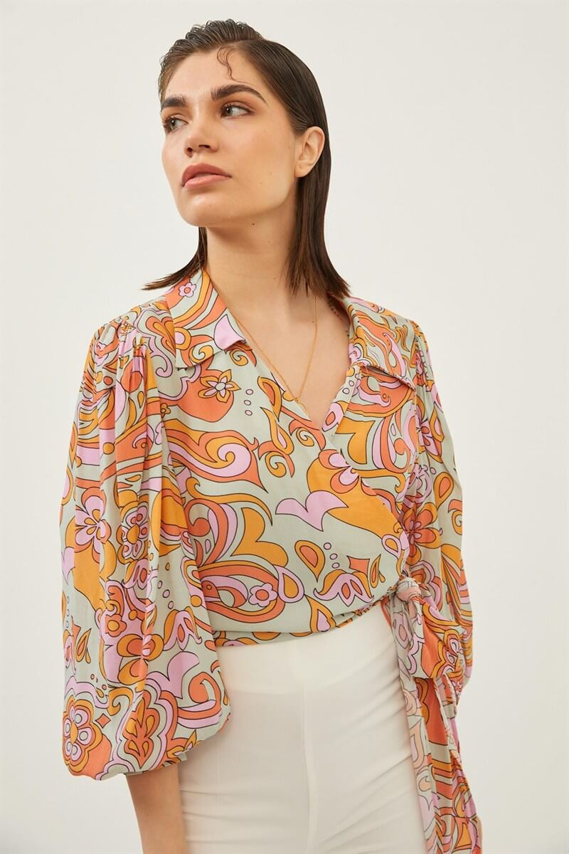 Deseni ve renkleriyle dikkat çeken bluzun retro hissini kombinlerinize yansıtmak için ispanyol paça pantolonlar ve jeanlerinizle kombininizi tamamlayın.