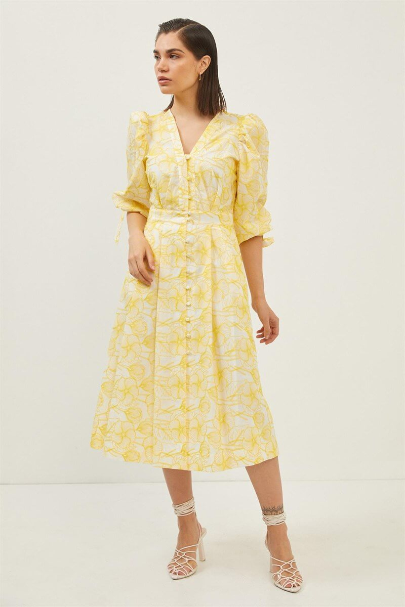 Romantik ve feminen stiller için tek adımda şıklık yaratan midi boy pamuklu elbise dokuması ile hareketlenirken kalıp formuyla da şıklık ve konforu bir araya getiriyor.