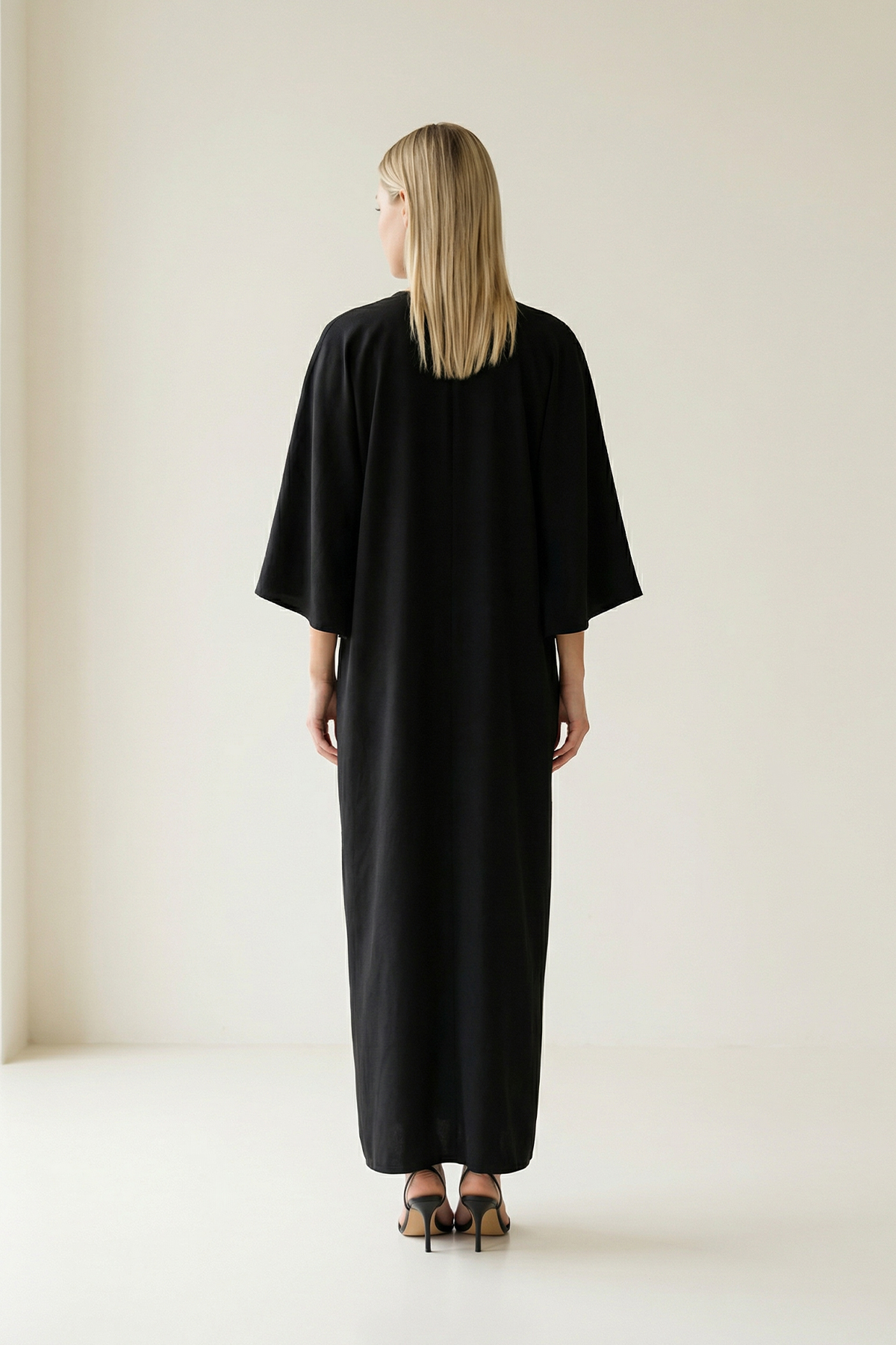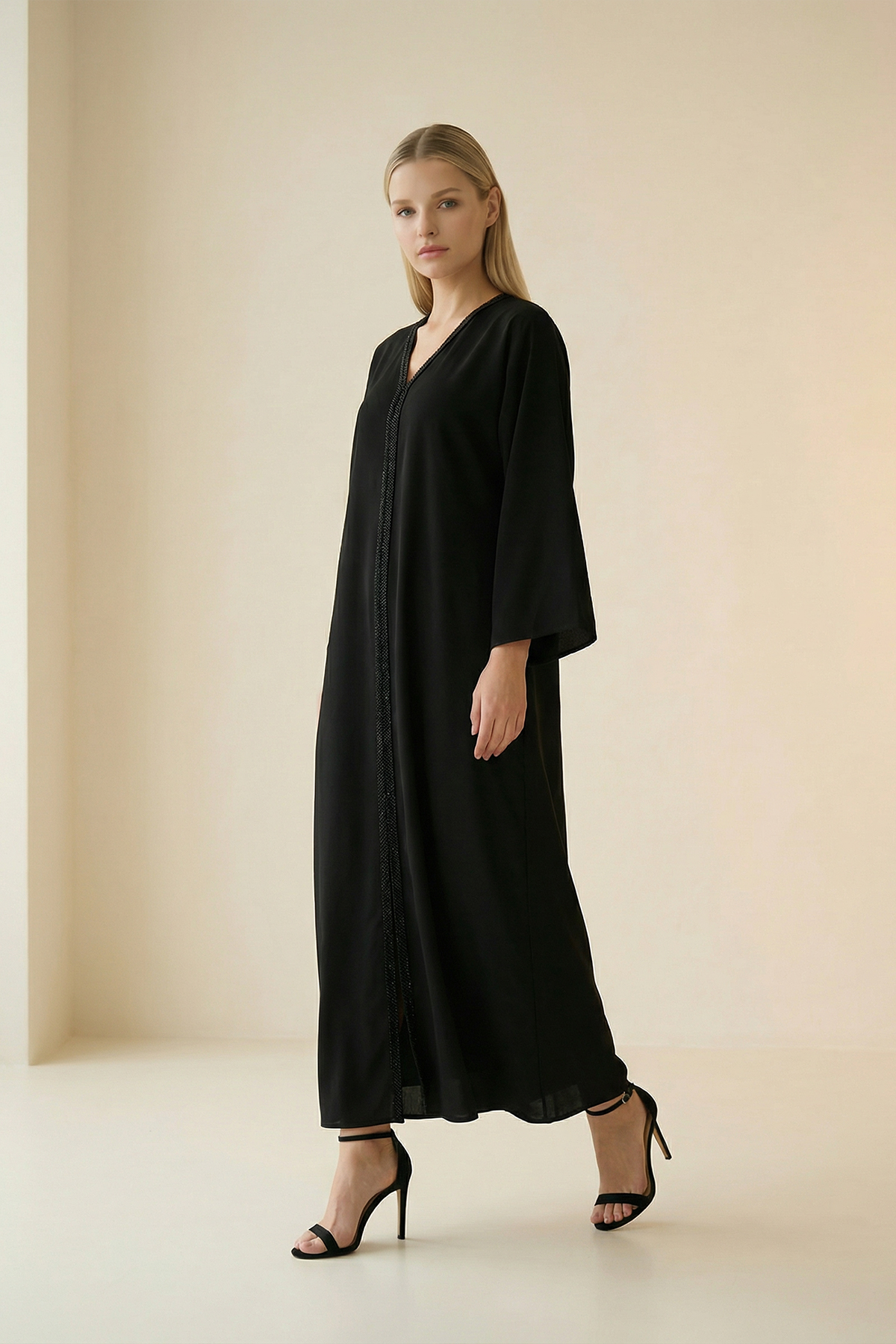 V yaka formu ve taş detaylarıyla zarif bir ışıltı sunan bu elbise, yırtmaç detayıyla silüete modern bir hareket kazandırır. Rahat kesimi gün boyu konfor sağlarken, akıcı yapısı hem günlük şıklıkta hem de akşam kombinlerinde dengeli ve feminen bir duruş sunar. Zamansız tasarımıyla gardırobun öne çıkan parçalarından biridir.