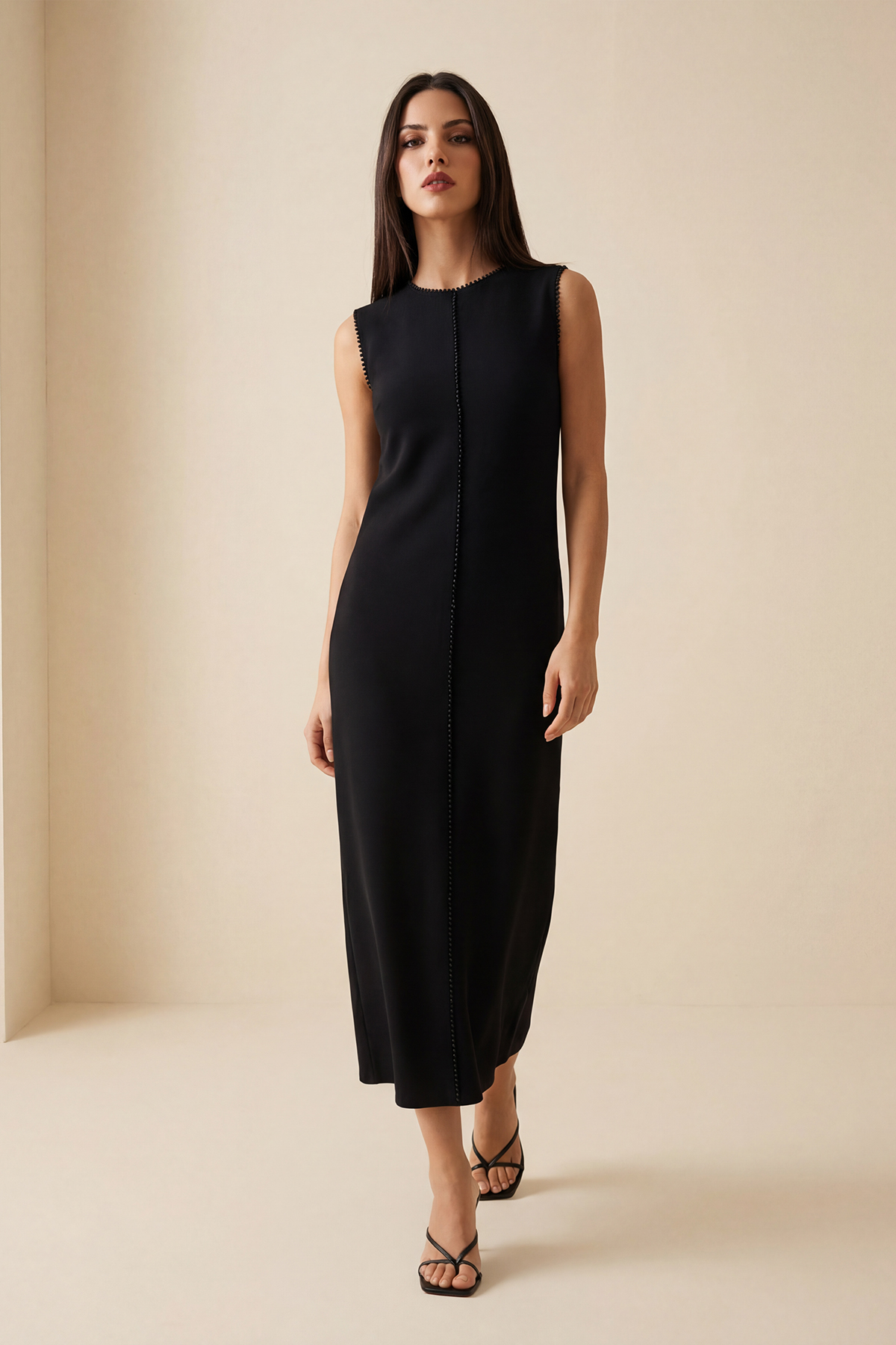 Bisiklet yaka ve kolsuz tasarımıyla sade bir şıklık sunan bu midi boy elbise, taş detaylarıyla görünüme zarif bir ışıltı katar. Rahat kesimi sayesinde gün boyu konfor sağlarken, akıcı formu hem günlük şıklıkta hem de akşam kombinlerinde dengeli ve feminen bir duruş sunar. Zamansız tasarımıyla gardırobun öne çıkan parçalarından biridir.