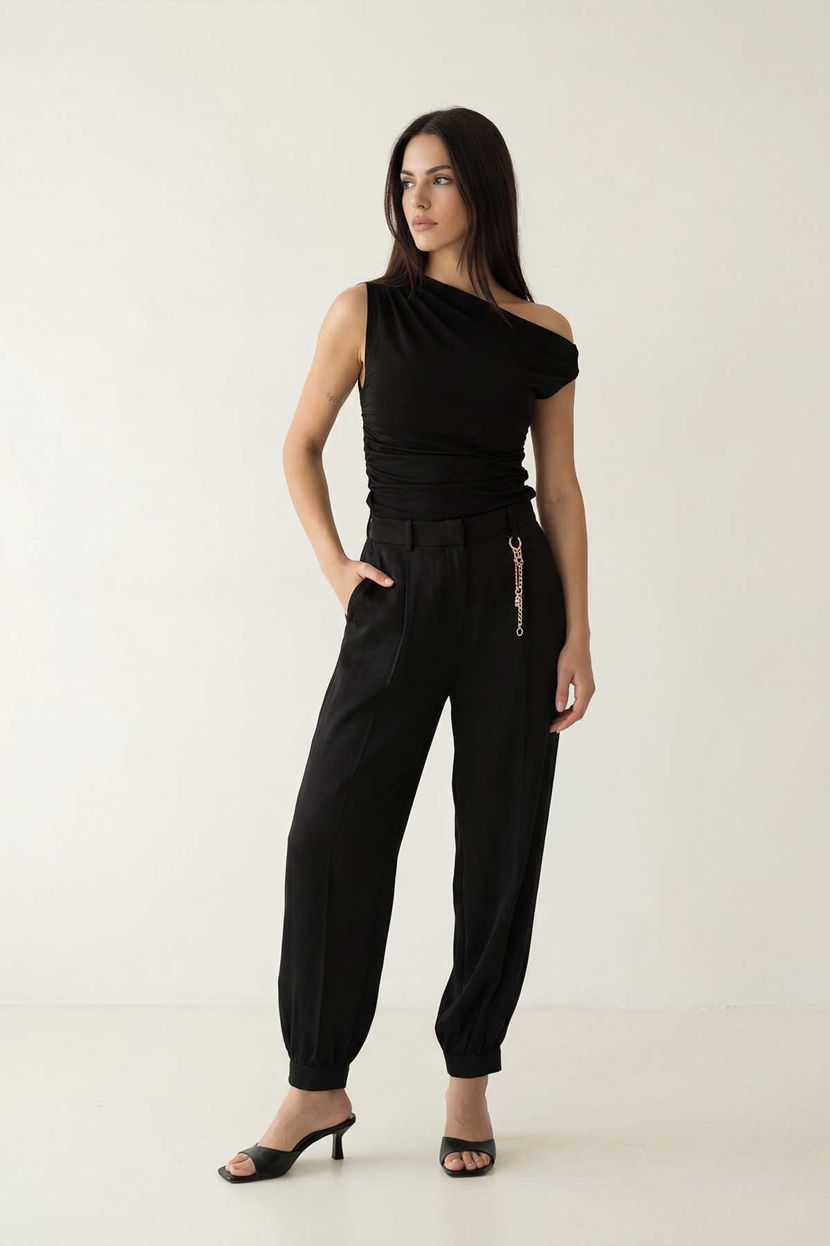 Paça kısmındaki aksesuar detayıyla tasarımına modern ve dikkat çekici bir vurgu kazandıran bu cepli pantolon, rahat kesimi sayesinde gün boyu konfor sunar. Akıcı formu silueti doğal bir şekilde dengelerken, paça aksesuarı stile sofistike ve dinamik bir karakter katar. Günlük şehir kombinlerinden çağdaş ofis stiline kadar çok yönlü ve zamansız bir kullanım sunar.