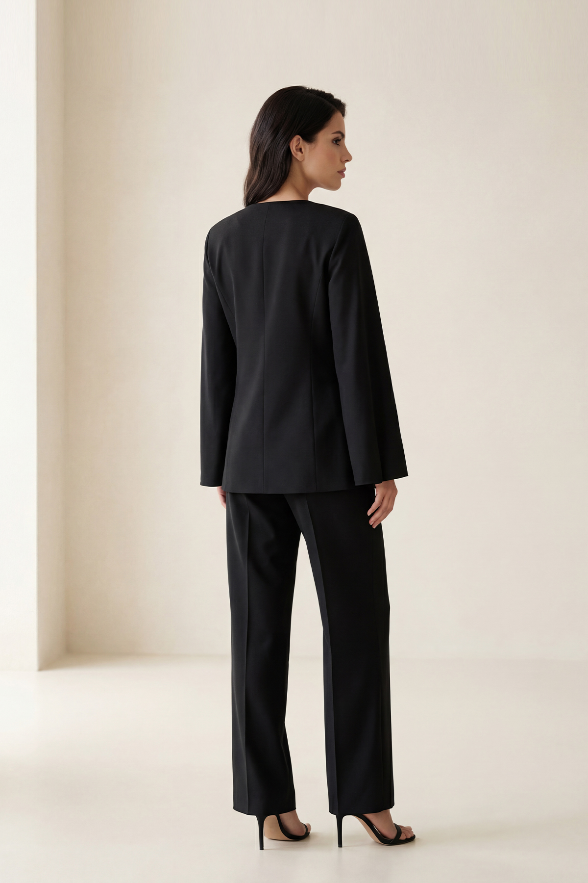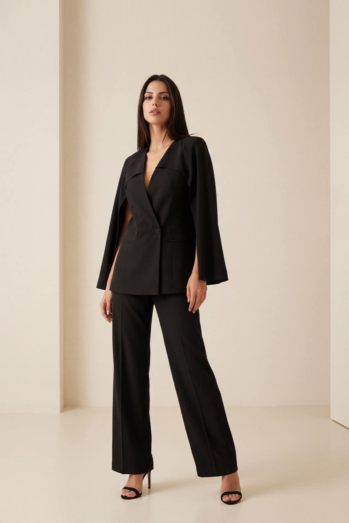Pelerin detayıyla güçlü ve iddialı bir siluet sunan bu V yaka ceket ve tam kalıp pantolondan oluşan takım, modern şıklığın sofistike bir yorumunu yansıtır. Yapılandırılmış formu duruşu netleştirirken, pelerin detayı tasarıma zarif bir hareket kazandırır. Ofis şıklığından özel davetlere uzanan kullanımıyla, zamansız ve etkileyici bir stil ifadesi sunar.