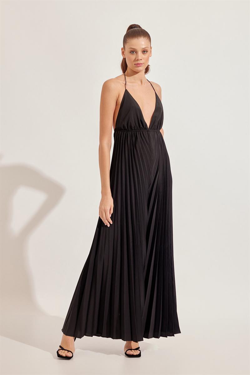 Boyundan bağlama detayı ile dikkat çeken tulum modern ve şık bir silüet yaratıyor.