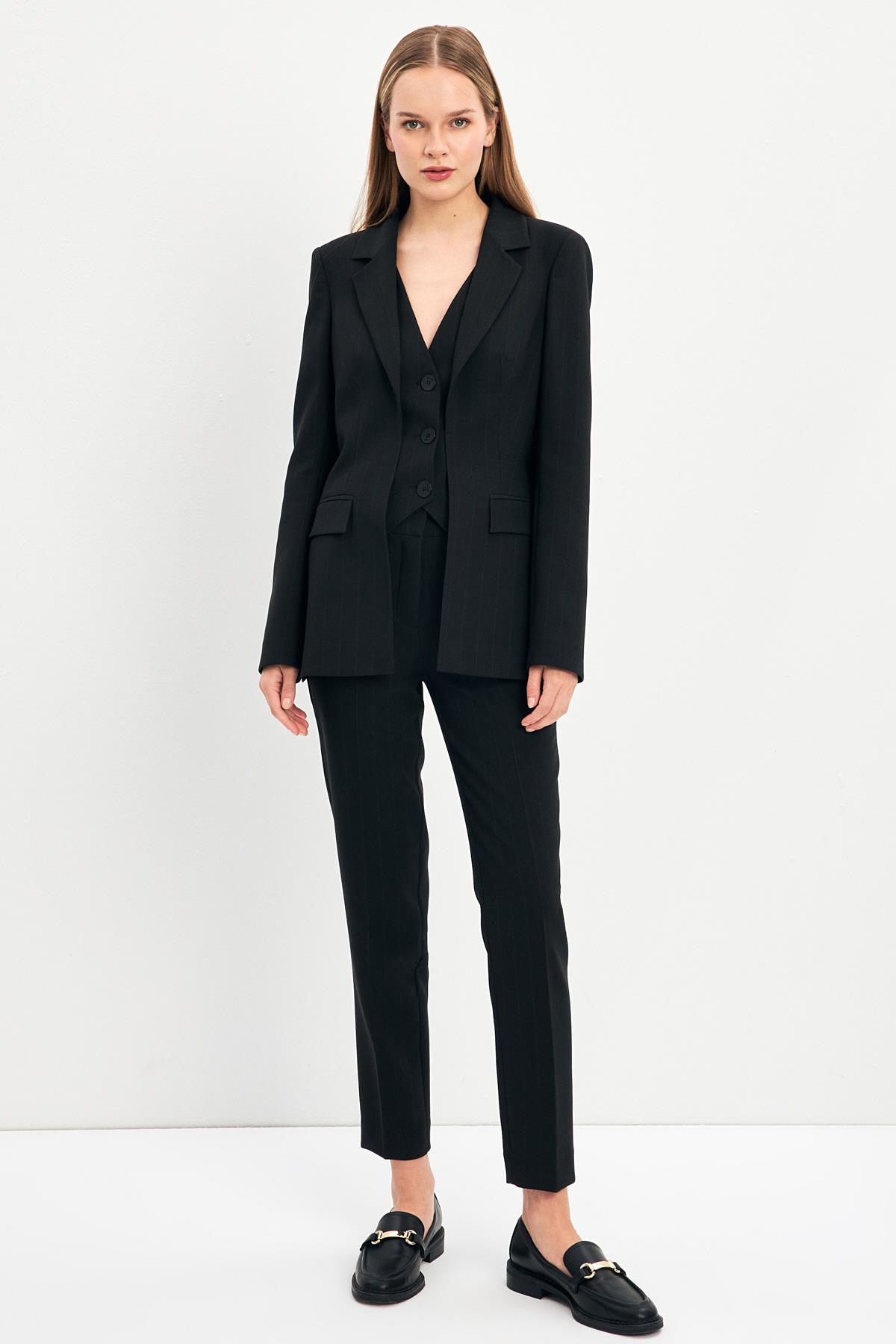 Çizgili düğme detaylı ceket ve çizgili pantolonlu takım, modern zarafeti ve şıklığı bir araya getiriyor. Ceketin ince çizgili deseni, hem klasik hem de çağdaş bir hava katarken, düğme detayları ise tasarımına sofistike bir dokunuş ekliyor. Pantolonun çizgili deseni, takımın bütünlüğünü koruyarak profesyonel bir görünüm sağlıyor. Bu takım, iş yerinden özel etkinliklere kadar her durumda şıklığınızı artırır ve zarif bir duruş sergiler. Hem rahat hem de şık olan bu kombin, gardırobunuzda vazgeçilmez bir parça olacak.